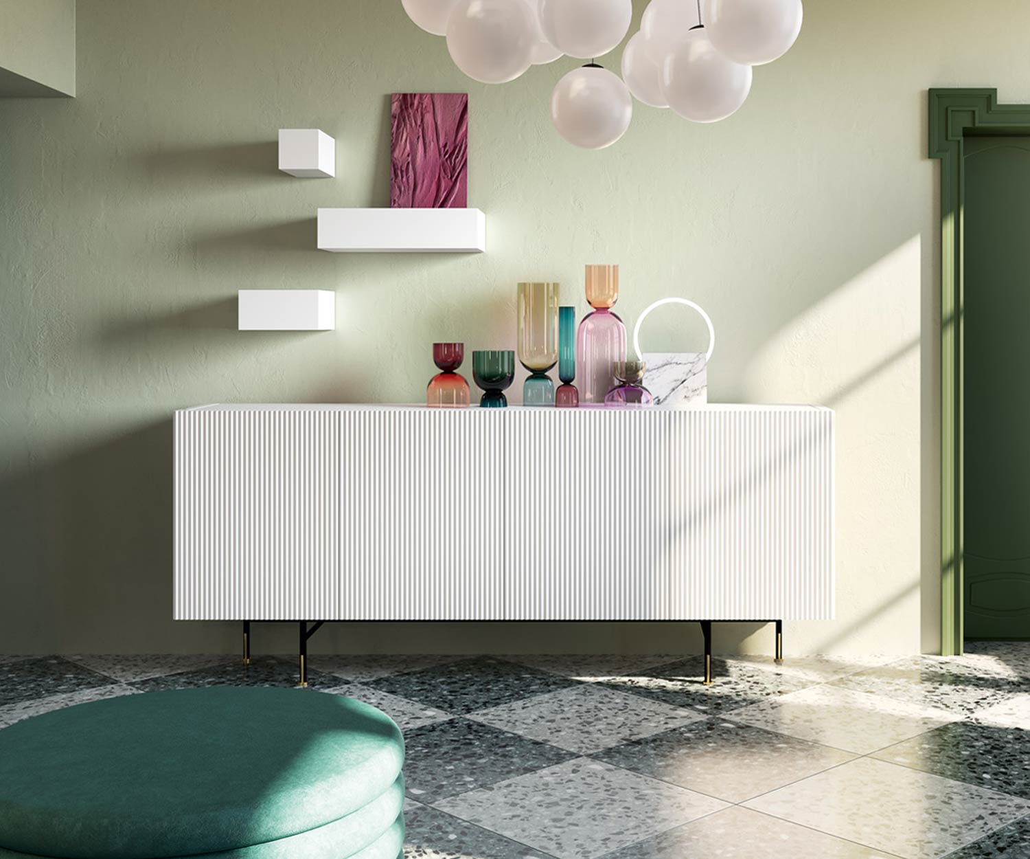 De deuren van het dressoir zijn gemaakt van een hoogwaardige MDF-plaat, met fronten en buitenzijden in een verticaal geribbeld golfpatroon.