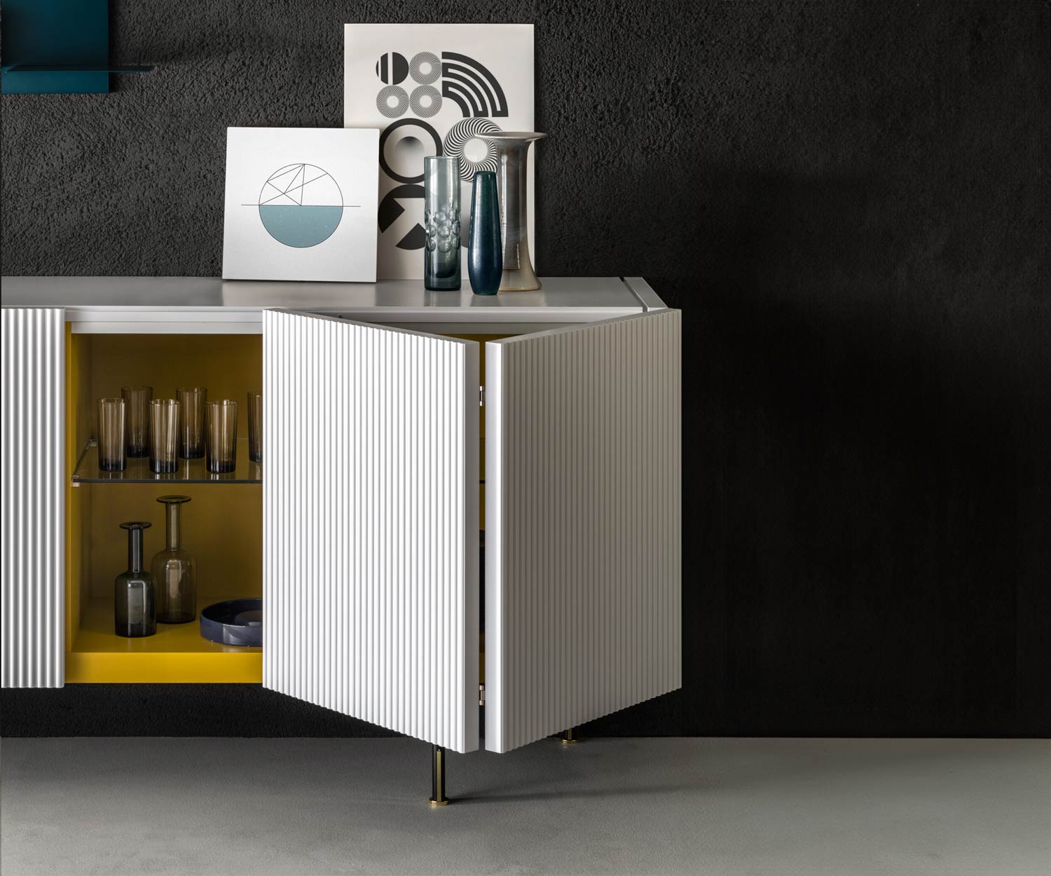 Het Capo d'Opera Aero Design dressoir - ontworpen door Alessio Bassan - betovert met zijn ongebruikelijke golfpatroon op de buitenzijden en fronten. Net als een geplooide haute couture jurk geeft een golvend, geribbeld motief vorm aan het silhouet van dit dressoir. De inklapbare stapelschuifdeuren openen als een glinsterend gordijn