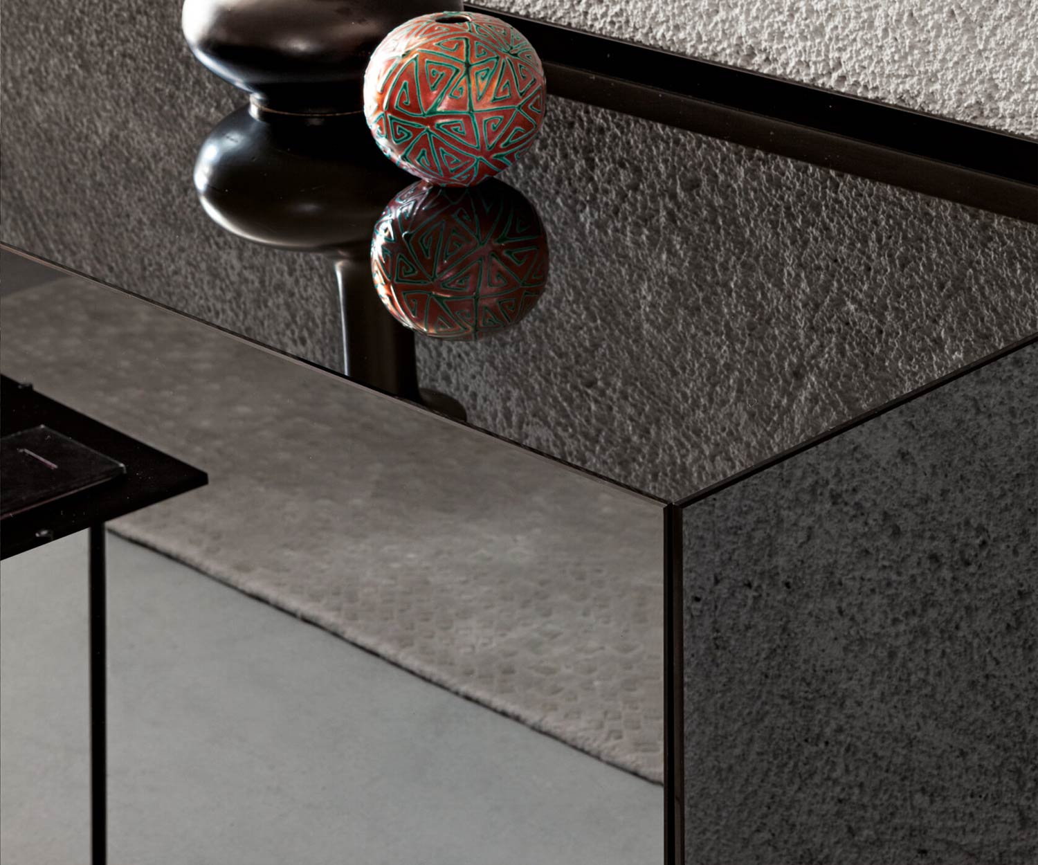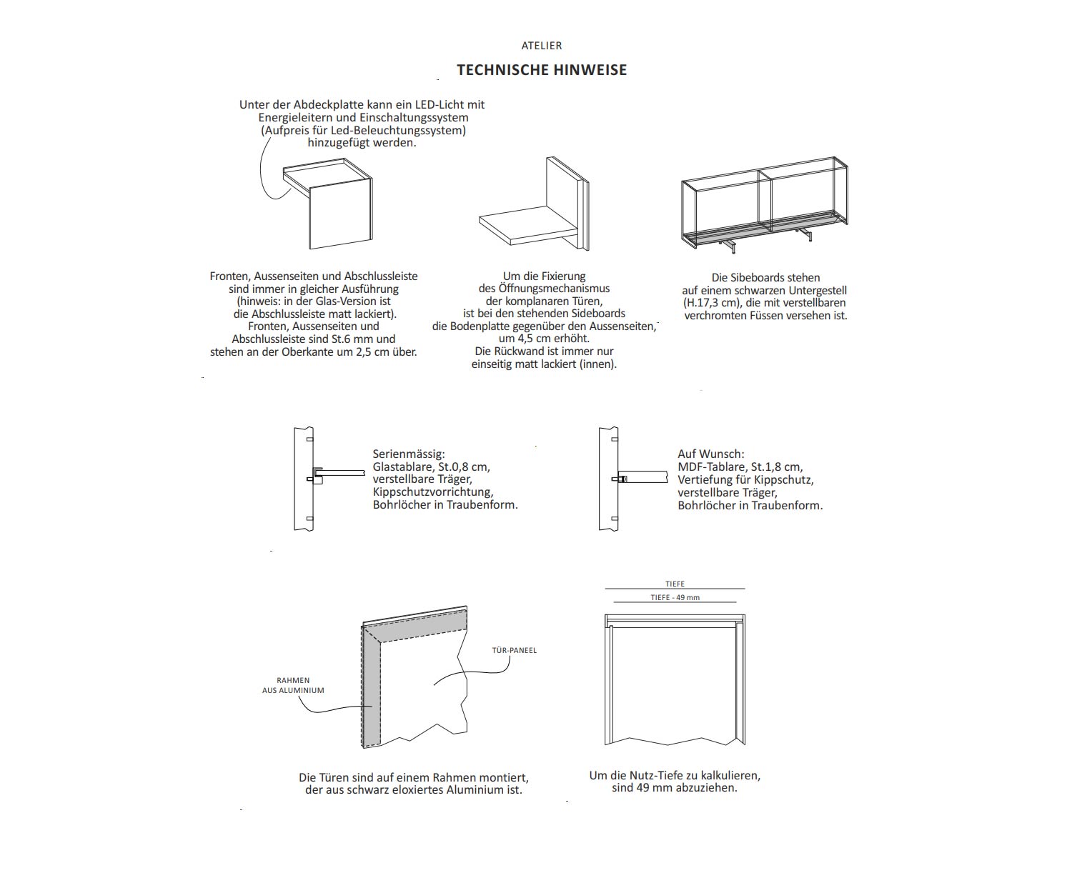 De romp van het Capo d'Opera Atelier dressoir is altijd verkrijgbaar in dezelfde hoogglans kleurafwerking op de fronten, buitenzijden, eindlijst en afdekplaat. Voor de kleurenversie in Stop Sol spiegelglas is de eindlijst mat gelakt. Het deurpaneel is gemonteerd op een frame van zwart geanodiseerd aluminium.