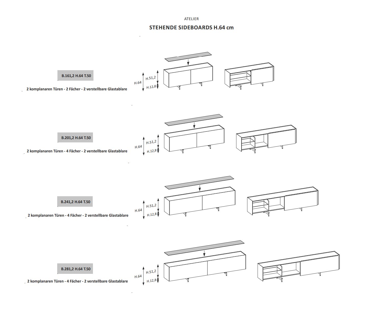 Het Atelier dressoir is verkrijgbaar in 4 verschillende breedtes: een kleine, compacte 161,2 cm brede versie, een iets groter model met een breedte van 201,2 cm, het grote model met een breedte van 241,2 cm en de XL-versie met eenbreedte van 281,2 cm.