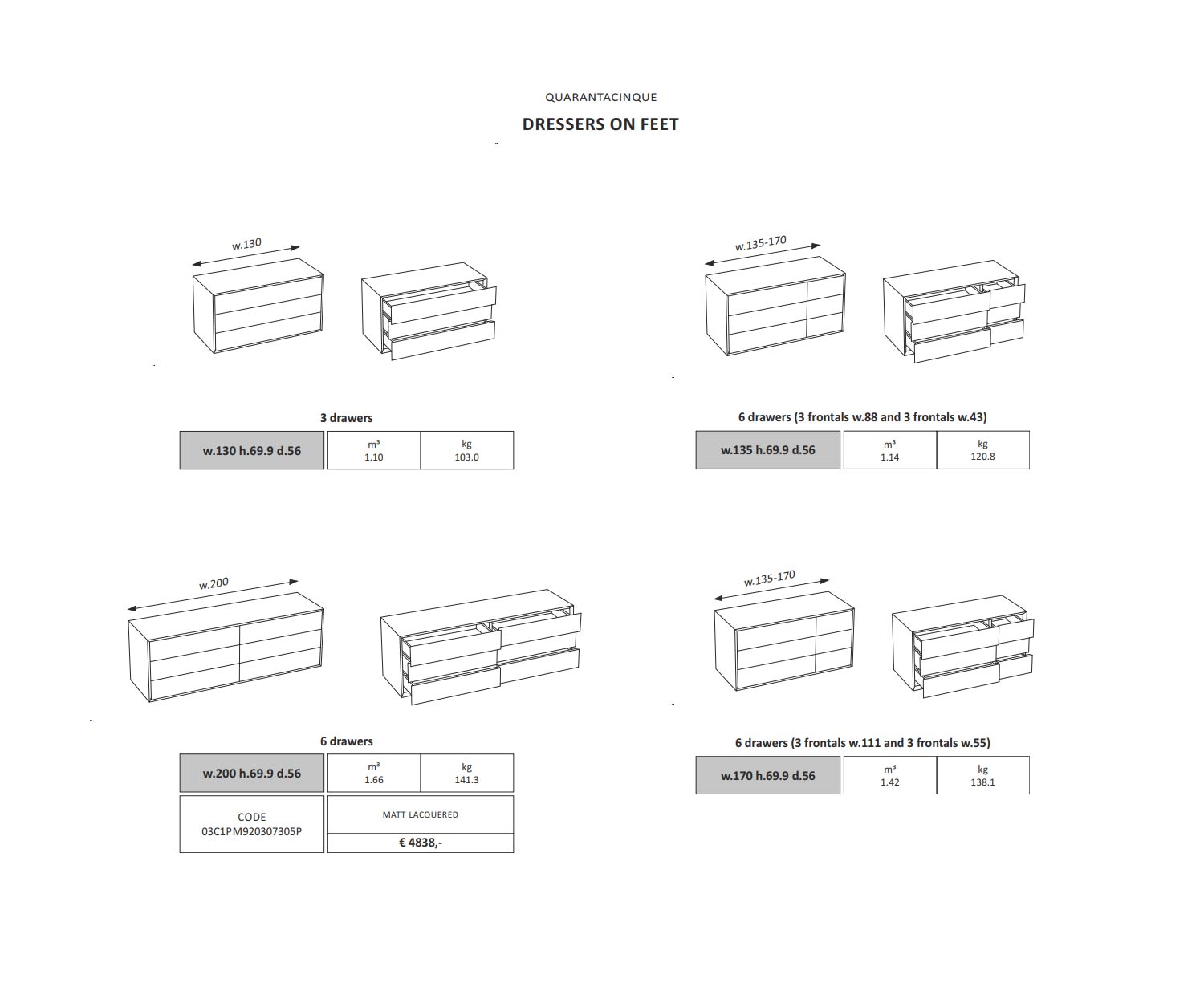 De Capo d'Opera Quarantacinque design ladekast is verkrijgbaar in de volgende afmetingen: