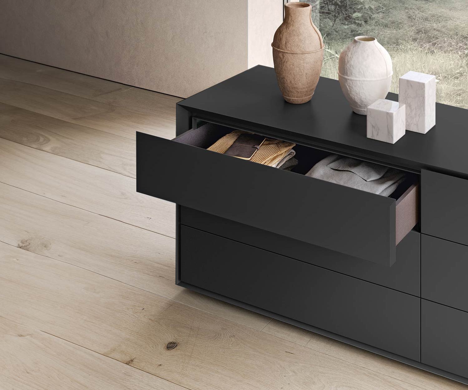 De binnenkant van de ladekast Capo d'Opera Quarantacinque is gemaakt van melamine.