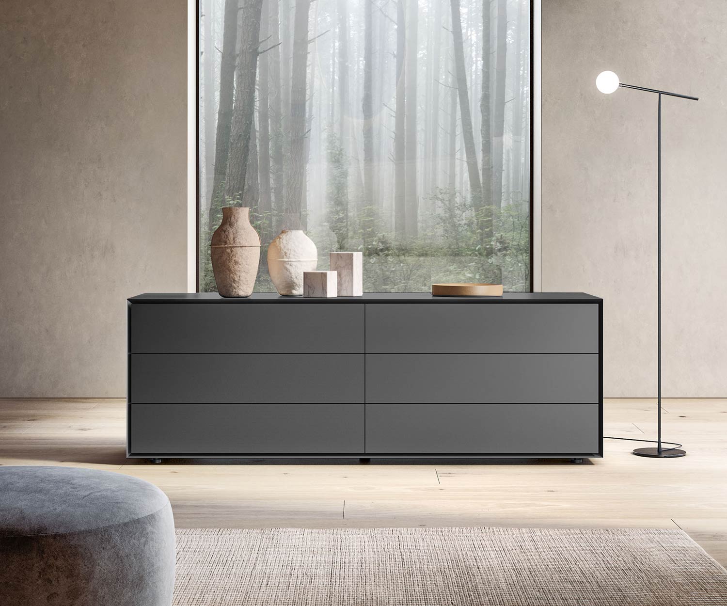 De 45° insnijdingen op de ladefronten lopen over de hele omtrek van de commode en dienen als geïntegreerde handgrepen die niet alleen functioneel zijn, maar ook het minimalistische ontwerp perfect benadrukken.