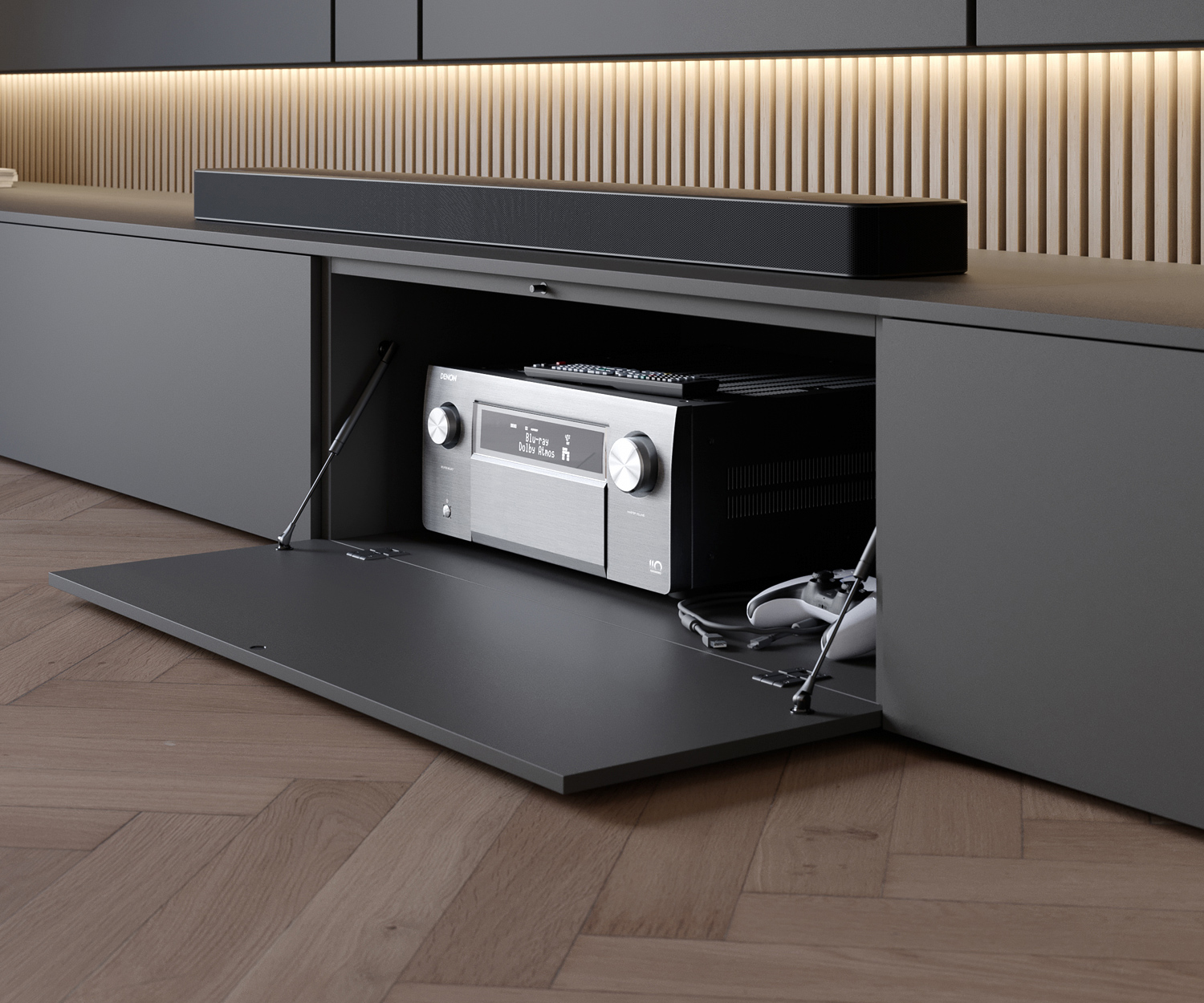 - Lowboard: Zwevend lowboard (360 cm) met drie draaideuren voor royale opbergruimte.