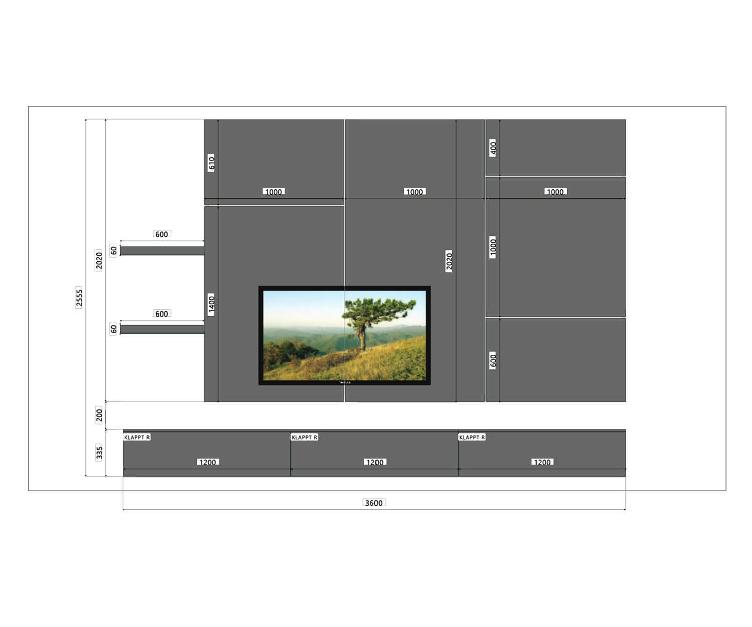 - TV-paneel: Breed paneel (300 cm), perfect voor TV's van meer dan 65 inch.