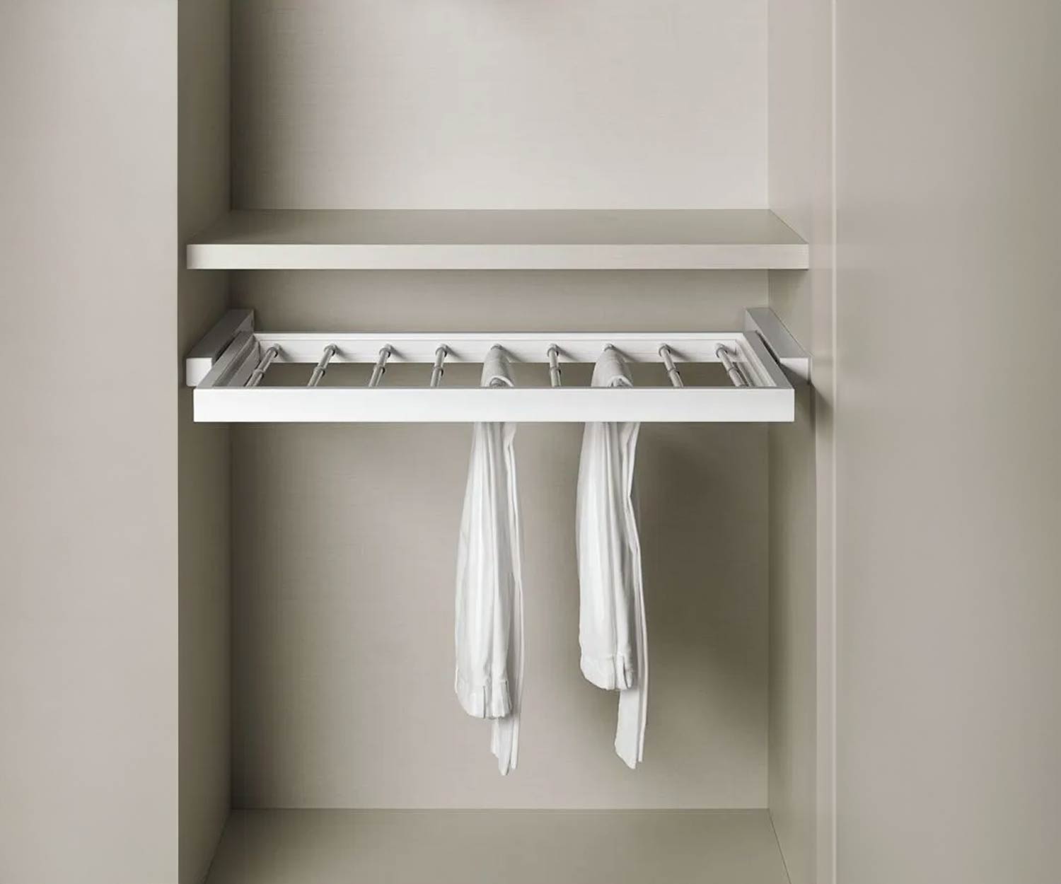 Armadi aluminium broekenrekken voor garderobekasten van Novamobili en Livitalia. Eenvoudig en kreukvrij opbergen van alle soorten broeken. Het broekenrek kan eenvoudig en geruisloos worden uitgetrokken dankzij de hoogwaardige schuifrails.