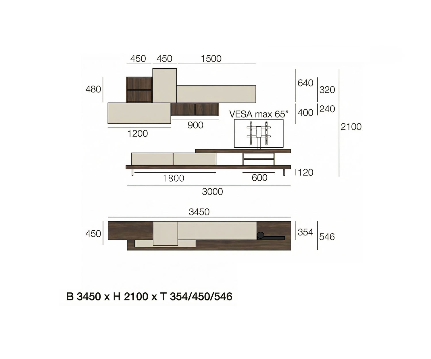B 345 cm / H 210 cm / D 35,4/45/54,6 cm