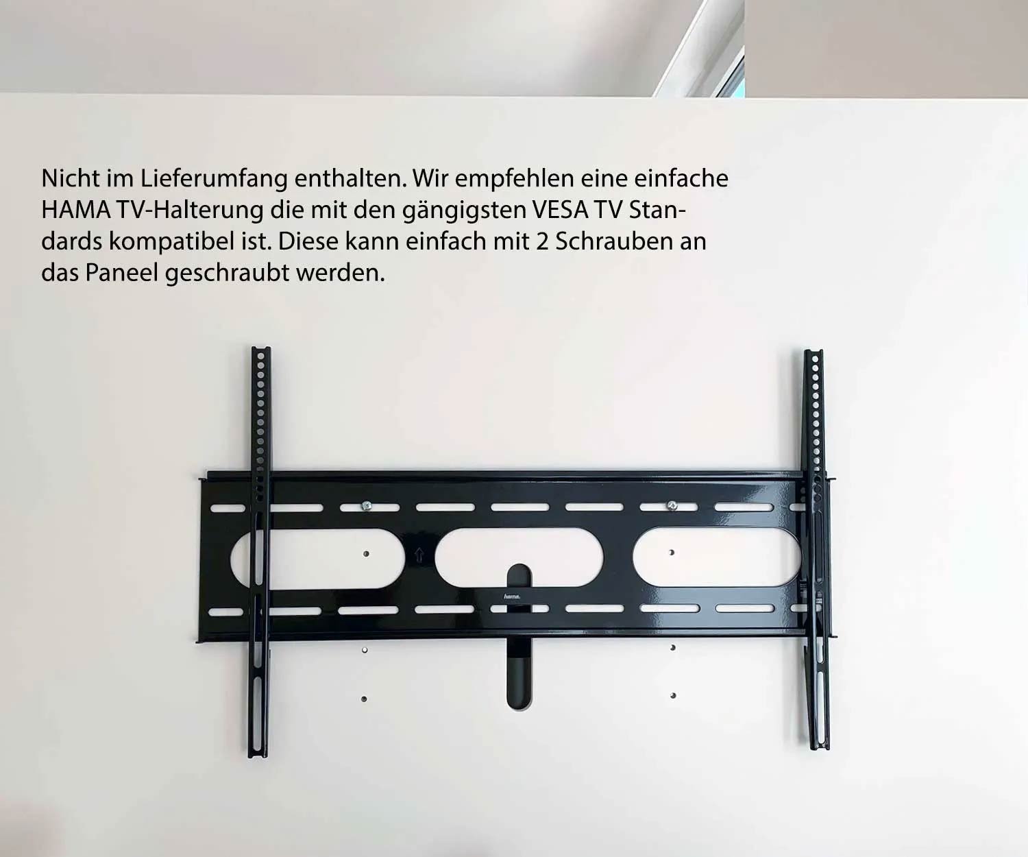 Extra gemak is ook voorzien: een soundbar kan op verzoek onder de tv worden geïntegreerd. Als het een muurbeugel heeft, kan het rechtstreeks worden bevestigd met houtschroeven. Als alternatief kan het ook met een verlengstuk aan de tv-beugel worden bevestigd - zonder te boren. Hiervoor wordt vooral het HAMA-model 00108746 aanbevolen .