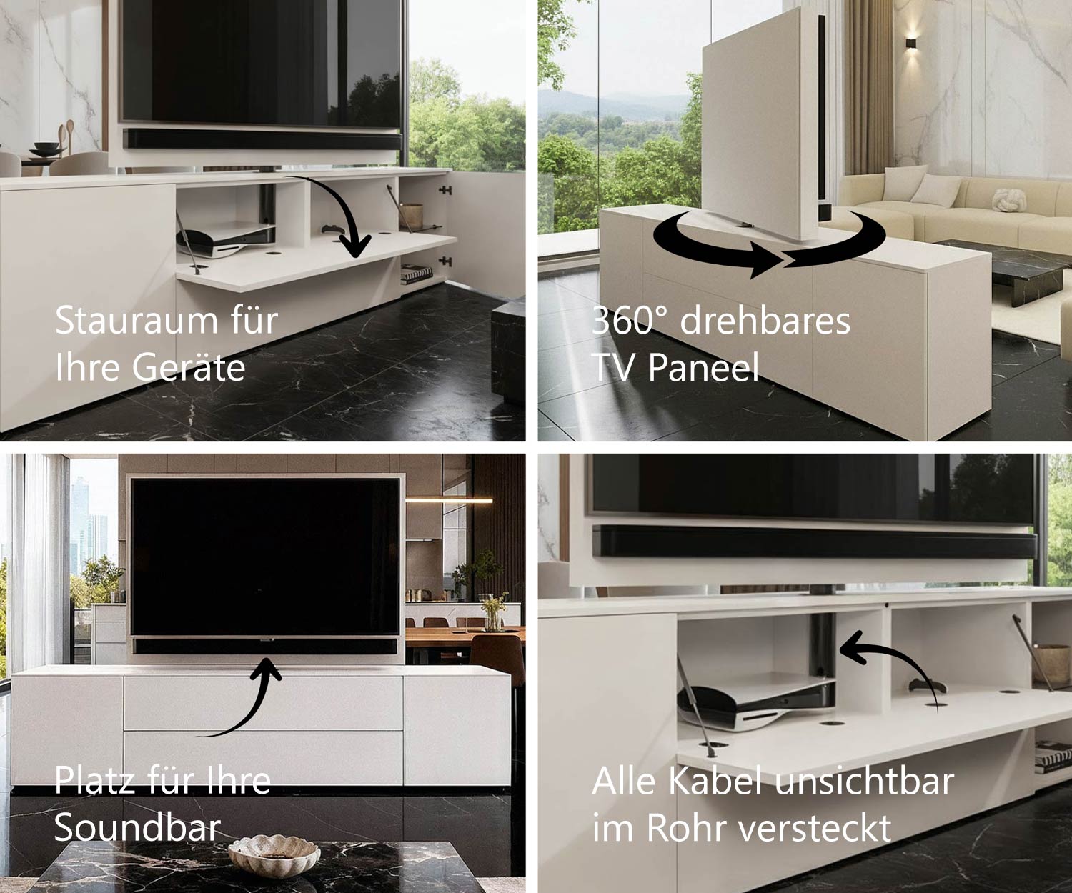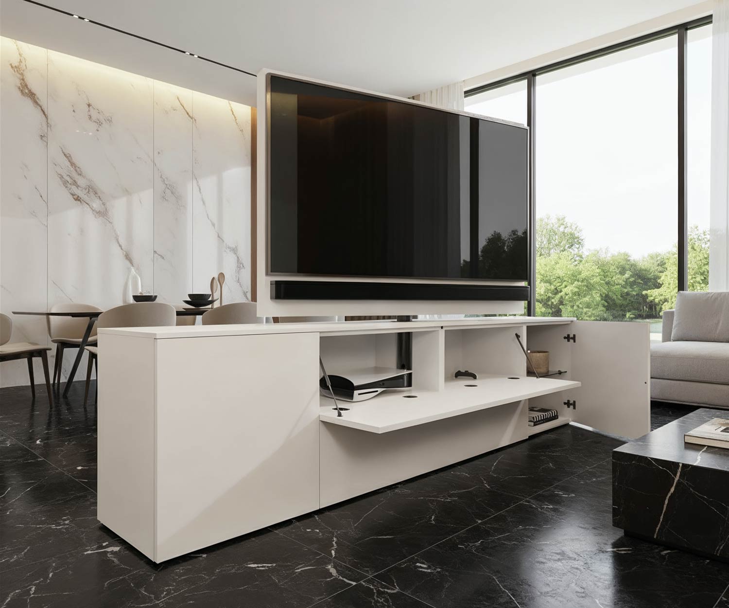 Het Livitalia Roto design dressoir combineert modern design met maximale flexibiliteit. Dankzij het draaibare tv-paneel is het perfect als stijlvolle ruimteverdeler tussen de woonkamer en de keuken. De voor- en achterkant zijn identiek ontworpen, zodat het dressoir er van beide kanten even elegant uitziet en naadloos in elk ruimteconcept past.