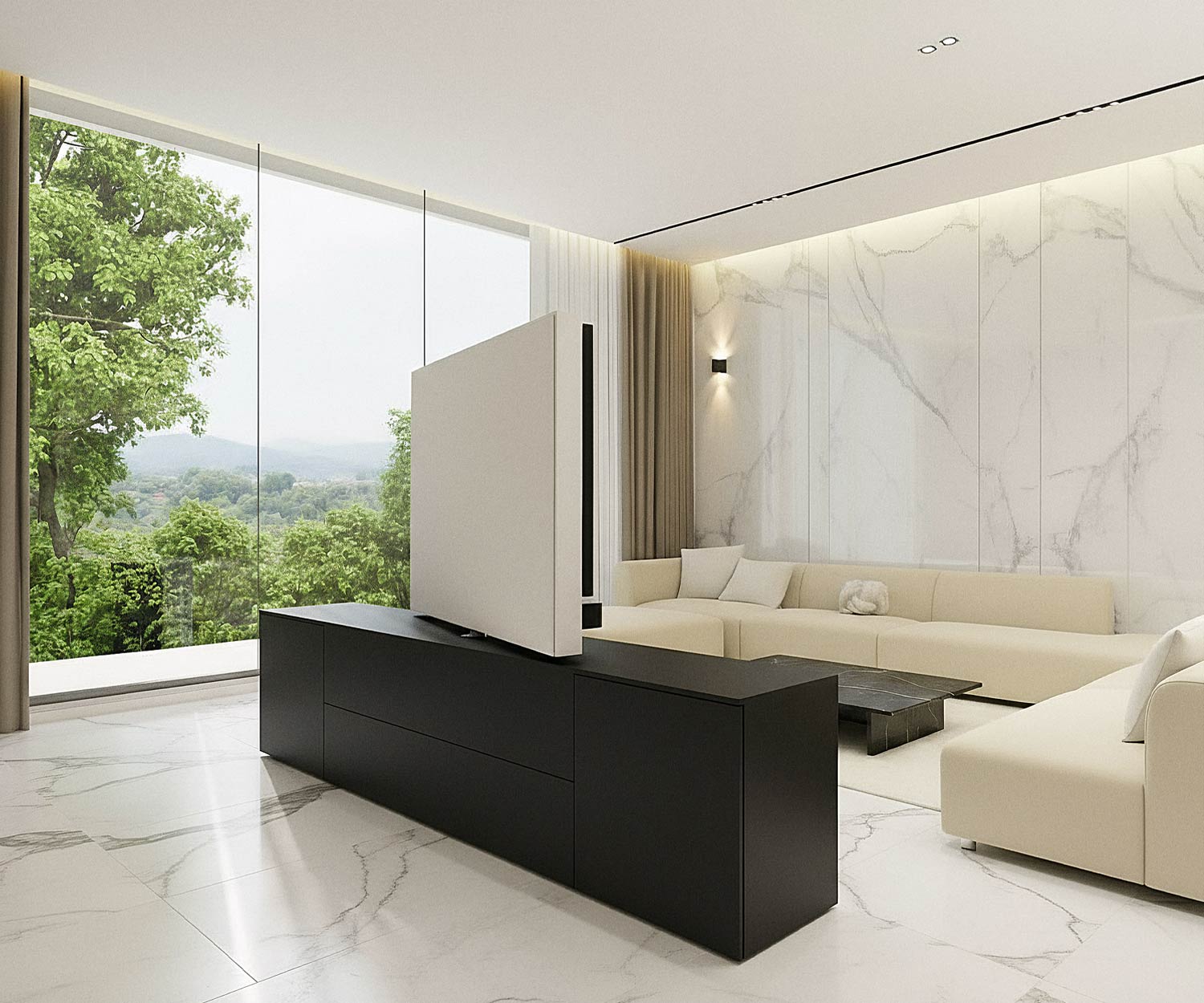 Das drehbare TV-Paneel hat unser Wohnzimmer in einen flexiblen Raum verwandelt, der jetzt viel lebendiger wirkt.