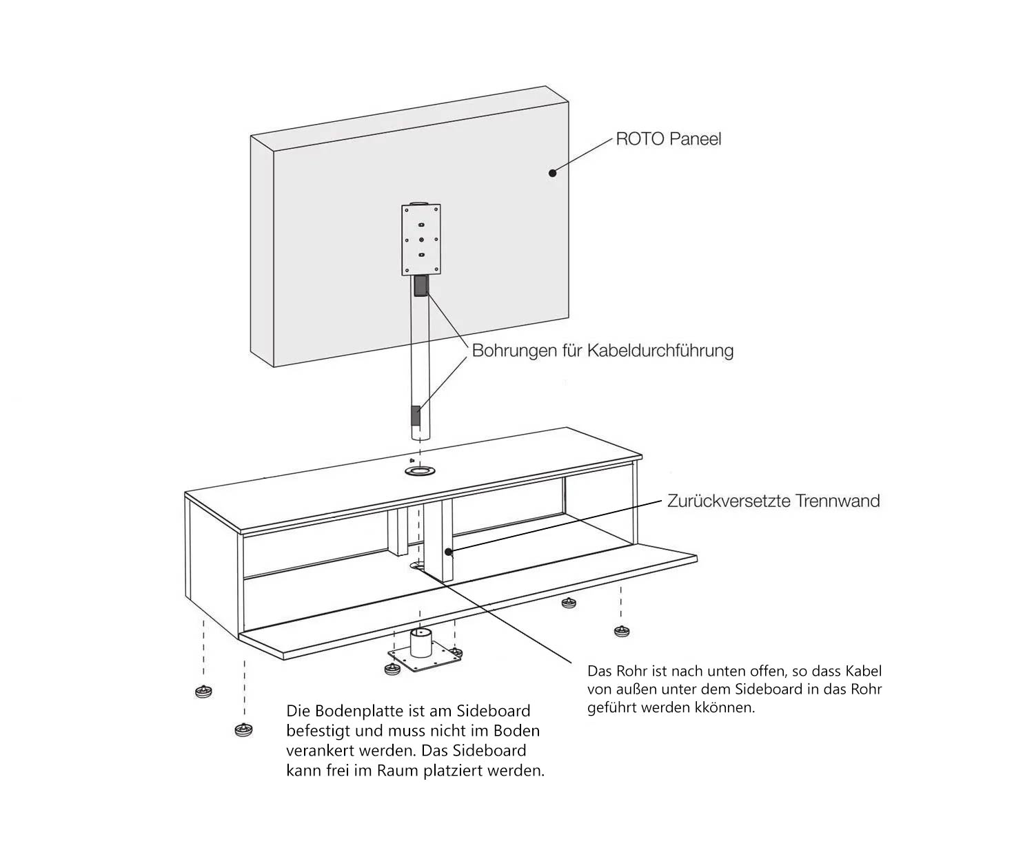 Het Roto dressoir wordt gedeeltelijk gemonteerd geleverd voor veilig transport, zodat de montage snel en eenvoudig kan worden uitgevoerd. Eerst worden de rompmodules gemonteerd en de poten aan de romp bevestigd, waarna het achterpaneel wordt gemonteerd. Het voorgemonteerde TV-paneel wordt aan de achterkant geopend om de steunbalk op de gewenste hoogte in te stellen. Hierdoor kan de afstand tussen het TV-paneel en het dressoir individueel worden aangepast.