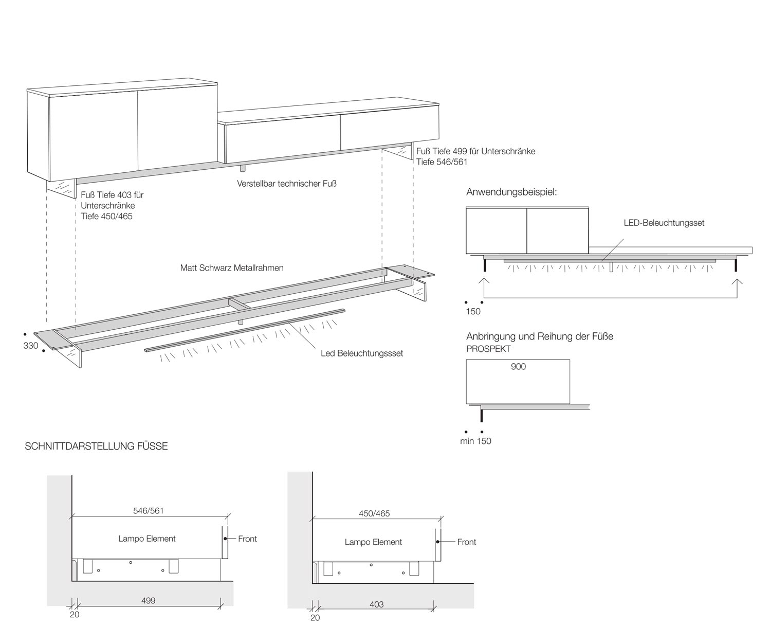 De sokkel heeft een zwart metalen frame dat aan de onderkant van het lowboard wordt vastgeschroefd. Met een diepte van 39,7 cm is de plint ondieper dan het lowboard en daardoor nauwelijks zichtbaar. In het midden zit een derde, in hoogte verstelbare poot. Dit voorkomt doorbuigen onder zware belasting. Onder de sokkel kan optioneel LED-verlichting (3000K) worden besteld.