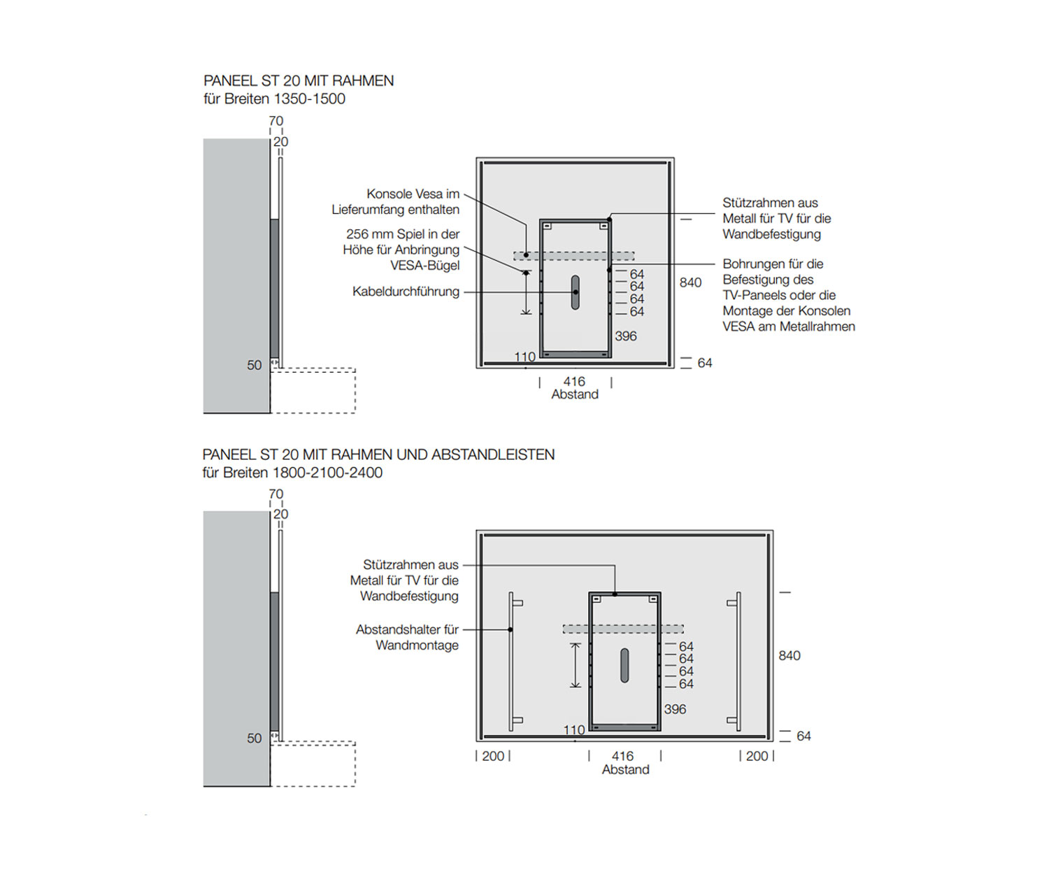 Het TV-wandpaneel wordt bevestigd op een stevige metalen steun. Dankzij het VESA-standaardgat kan elke niet-verstelbare tv-beugel worden bevestigd. De tv-beugel wordt bevestigd aan de metalen steun en kan gemakkelijk elke moderne tv ondersteunen. Let op: de meegeleverde pluggen zijn alleen bedoeld voor betonnen muren. Informeer naar het soort muur dat je hebt en gebruik geschikte pluggen!