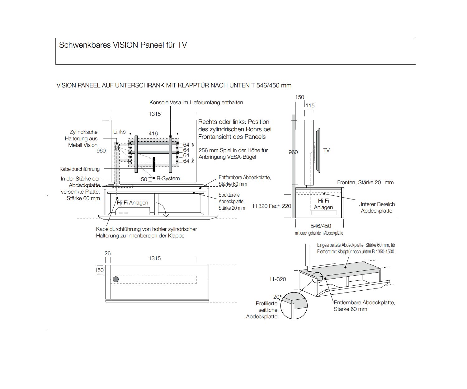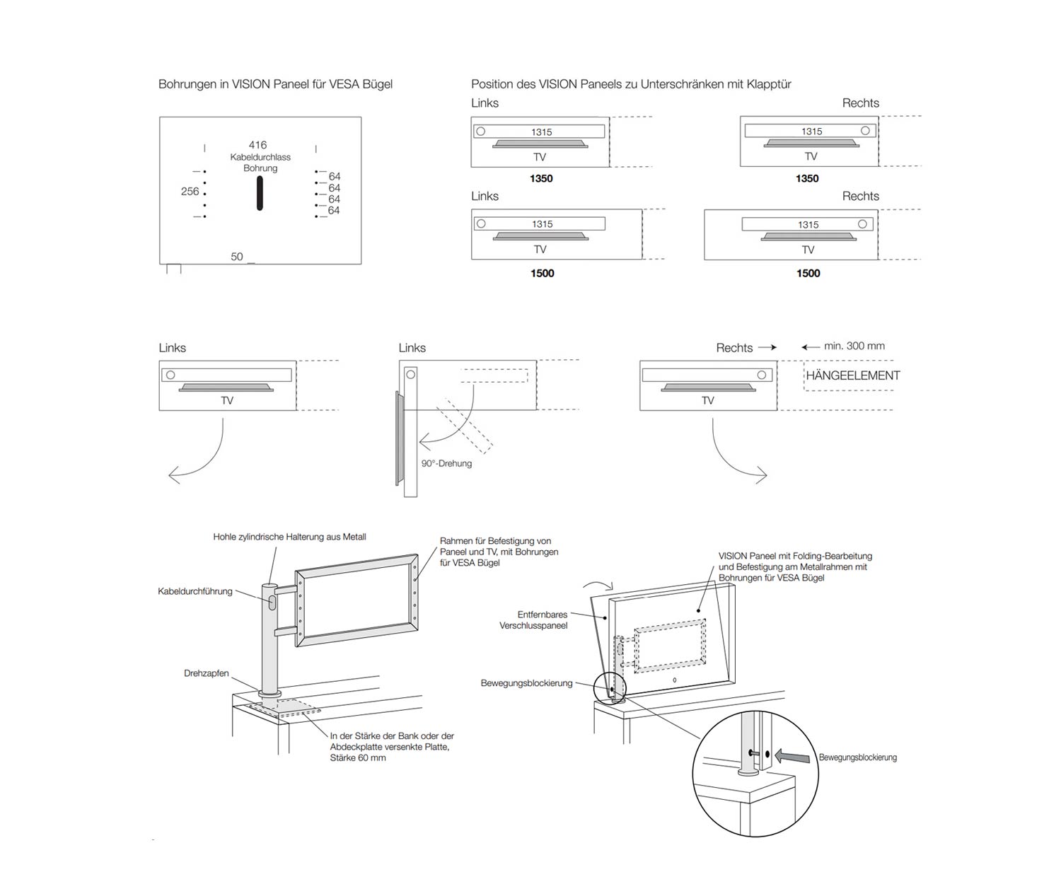 De klapdeur kan worden geopend door op de voorkant te drukken. Binnenin is er een scheidingswand en een buis die de kabels van de apparaten in het lowboard verbindt met de tv. Het TV-paneel kan tot 90° worden gedraaid. Het draaibare Vision TV-paneel heeft een breedte van 115 cm en is geschikt voor een TV van maximaal 50 inch. Aan het paneel kan een steun naar keuze worden bevestigd. Binnenin het TV-paneel bevindt zich een vlagvormige stalen steun die voor de nodige stabiliteit zorgt.