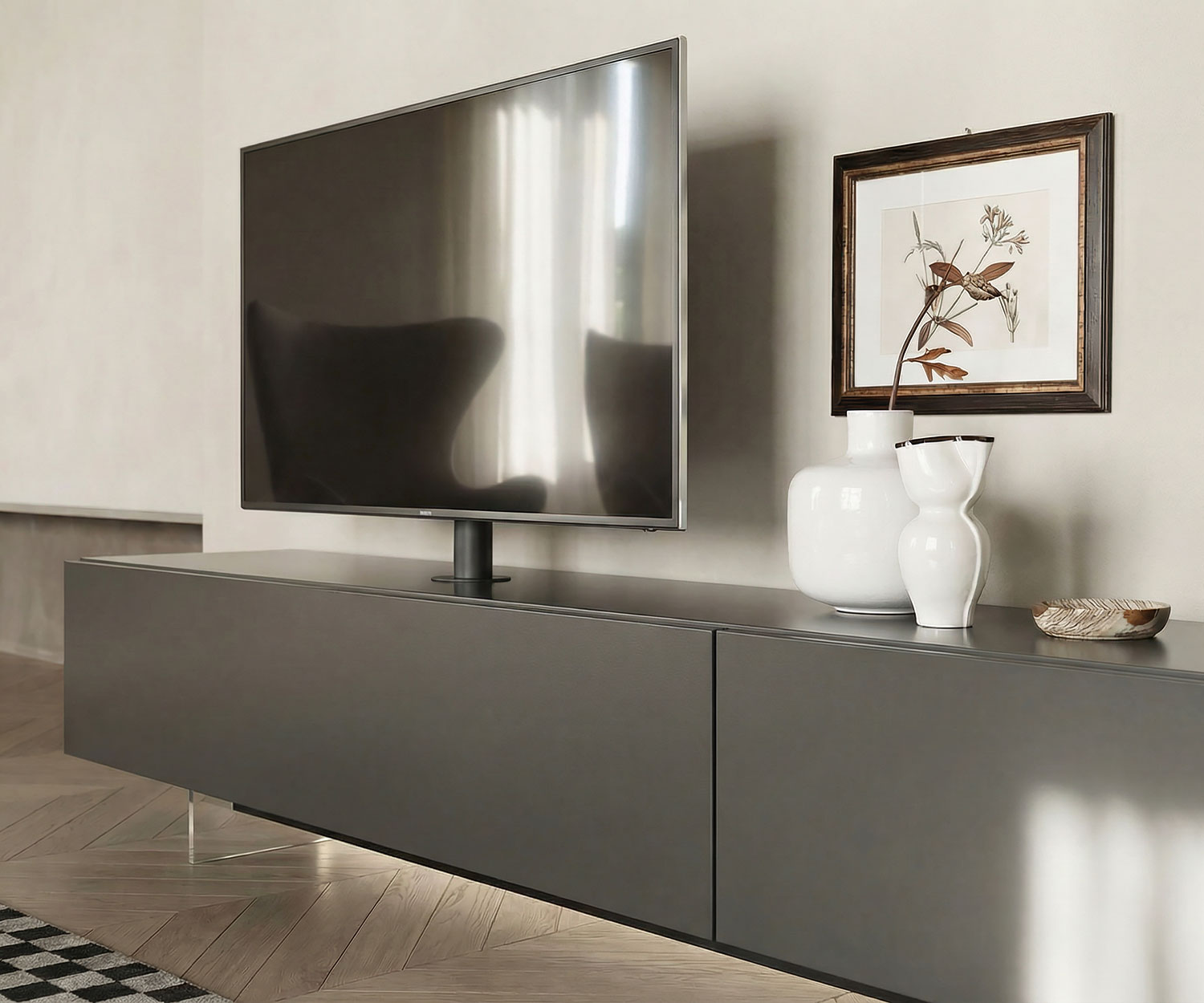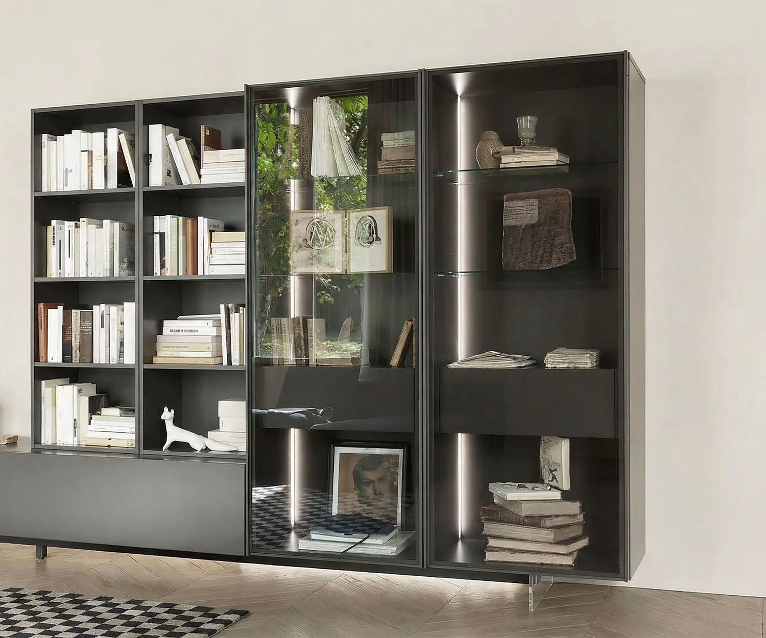 Elegant design wandmeubel C43 van Livitalia uit Italië. Het platte lowboard staat op transparante poten en heeft een tv-bevestiging die ook kan worden gebruikt voor gebogen tv's. De grote glazen kast heeft optionele LED-verlichting. Aanpassingen op maat zijn mogelijk op aanvraag.