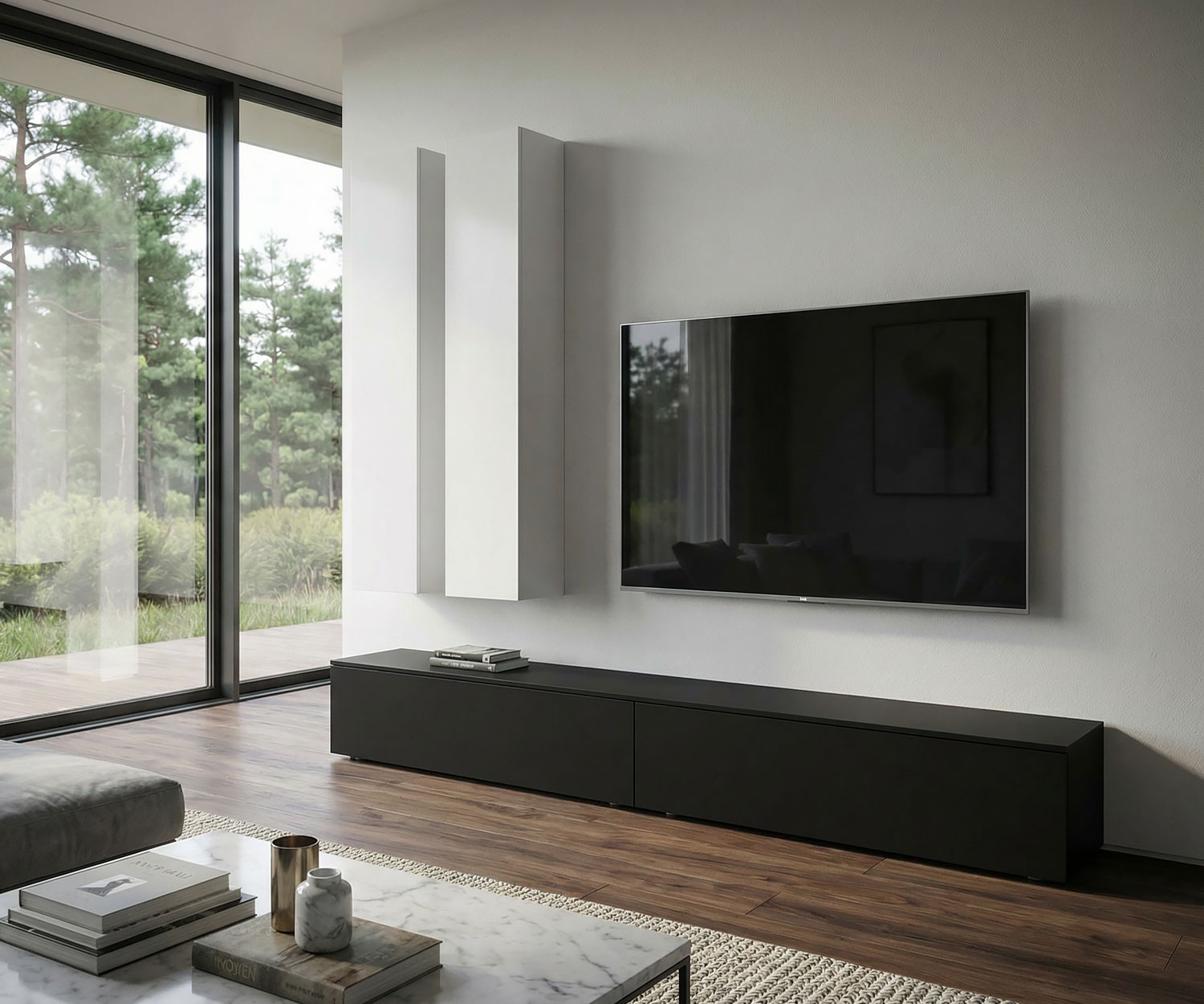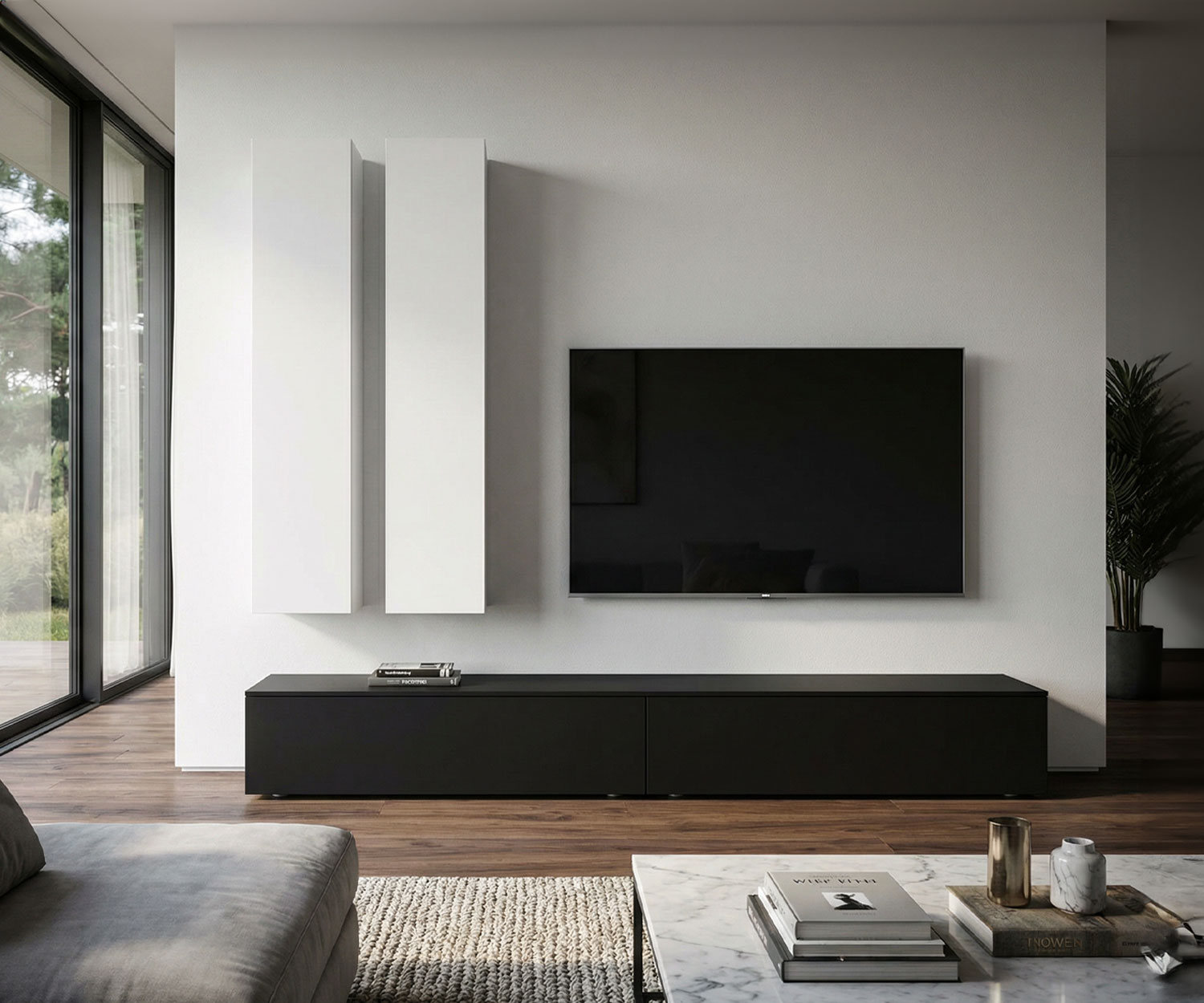 Verwandeln Sie Ihr Wohnzimmer in eine Lounge der Extraklasse mit der Livitalia Wohnwand C106. Diese hochwertige Design-Wohnwand besticht durch ihr klares, italienisches Design und eine edle Oberfläche.Die Kombination aus geräumigem Box Lowboard und schwebenden Wandschränken bietet Ästhetik und Stauraum in Perfektion. Exklusiv für Sie in Italien gefertigt. Jede Wohnwand kann individuell auf Ihre Wünsche angepasst werden. Gerne erstellen wir für Sie eine maßgeschneiderte 3D-Visualisierung. Um mit der Planung direkt beginnen zu können, müssen Sie unser Service-Paket bestellen: 3D Planung & Angebot Paket Farbe: Das Lowboard ist in Matt Schwarz(RAL 9011) erhältlich. Die Hängeschränke...