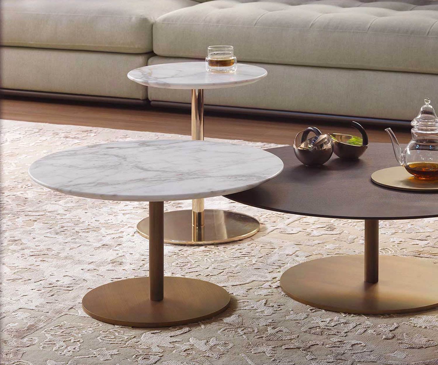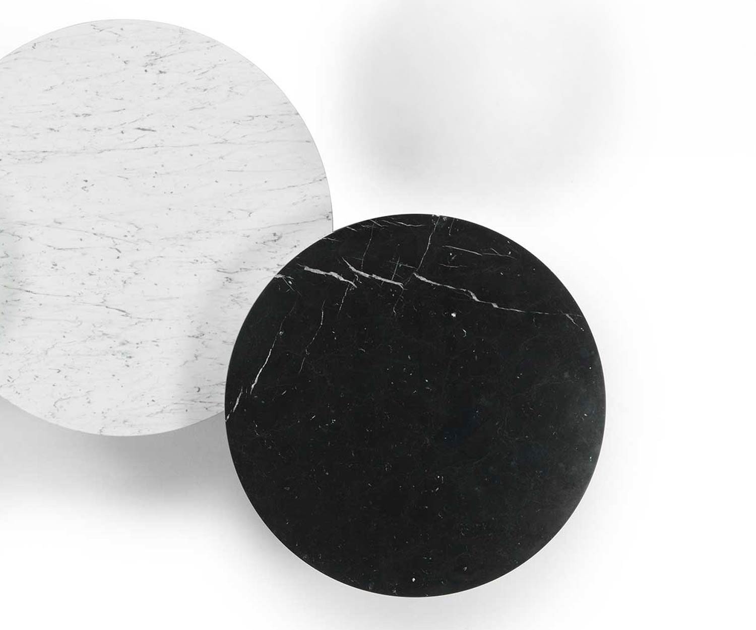 Het frame is gemaakt van 10 mm dik metaal en het tafelblad is gemaakt van 20 mm dik marmer (Carrara, Marquina, Perfetto) of 10 mm voor glas. De diameter van het onderstel is in beide gevallen 28 cm.