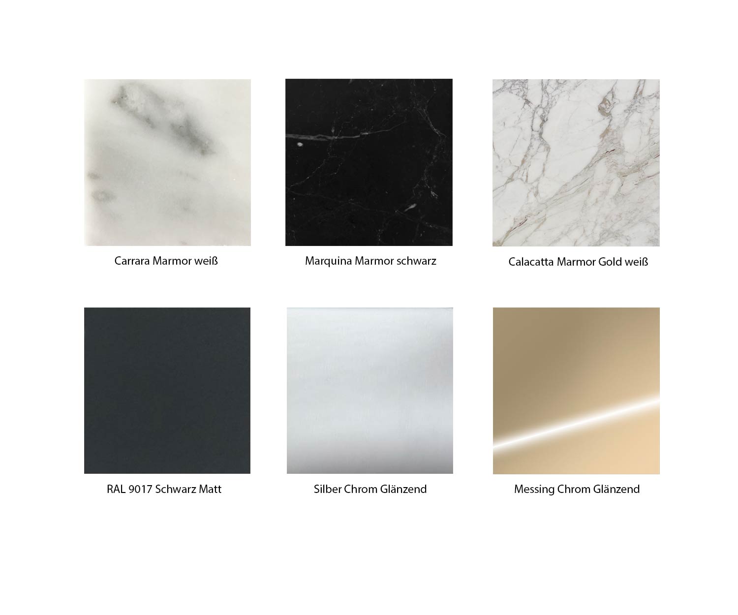 Het tafelblad van deze luxe eettafel van Marelli is naar keuze uitgevoerd in fijn Carrara marmer of andere hoogwaardige soorten zoals Marquina Black marmer, Calacatta Gold, Black & Gold of Emperador marmer. De laatste variant is een tafelblad afgewerkt met donkergrijs gebeitst eikenfineer. De poten van het onderstel zijn gemaakt van metaal en gelakt in een matte of glanzende kleur. Het frame van de eettafel is gemaakt van staal en is verkrijgbaar in RAL 9017 mat zwart, RAL 9016 mat wit, goud mat gelakt, chroom zilver, chroom zwart of glanzend messing goud . Als impregnering als optie wordt gekozen, wordt dit uitgevoerd in X-Stone of als polyester coating.