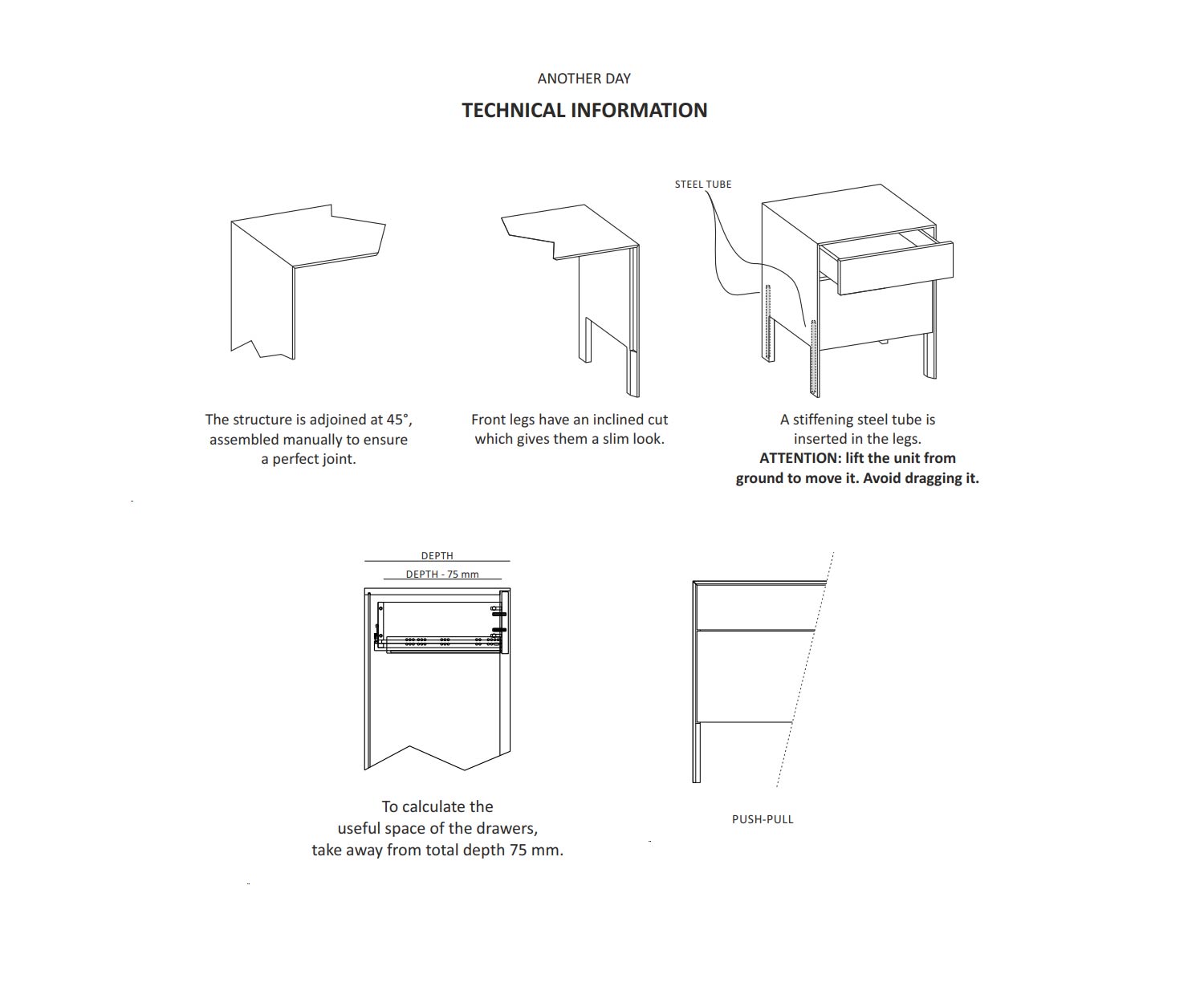 Het nachtkastje Another Day wordt gekenmerkt door zorgvuldig vakmanschap, waarbij de structuur in een hoek van 45 graden is samengevoegd. Dit zorgt niet alleen voor een esthetisch aantrekkelijke uitstraling, maar verhoogt ook de stabiliteit van het meubel aanzienlijk.
