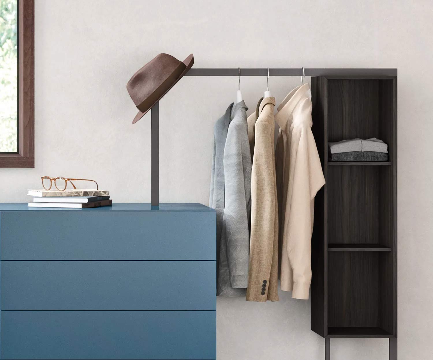 De Italiaanse design commode Easy 4 met kast van Novamobili is ideaal als stomme bediende die orde brengt in de slaapkamer of hal. Het modulaire systeem van de serie kan optimaal worden geconfigureerd en biedt opbergruimte en voldoende opbergruimte. De praktische ladekast met kledingroede wordt op bestelling gemaakt in Italië.