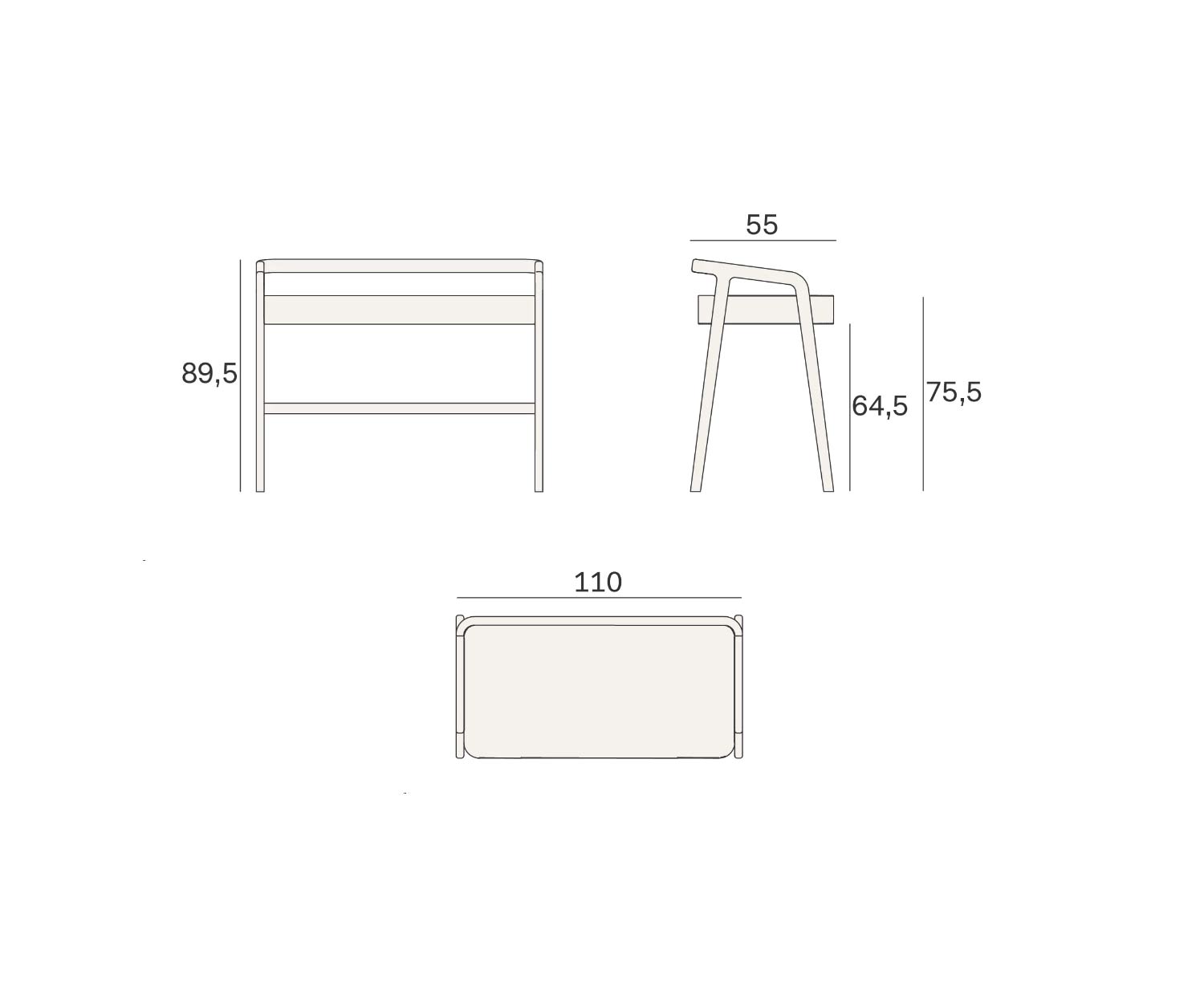 Buitenafmetingen: B 110 cm / H 89,5 cm / D 55 cm Tafelbladhoogte met poten: 75,5 cm Vrije hoogte onder de tafel: 64,5 cmGewicht