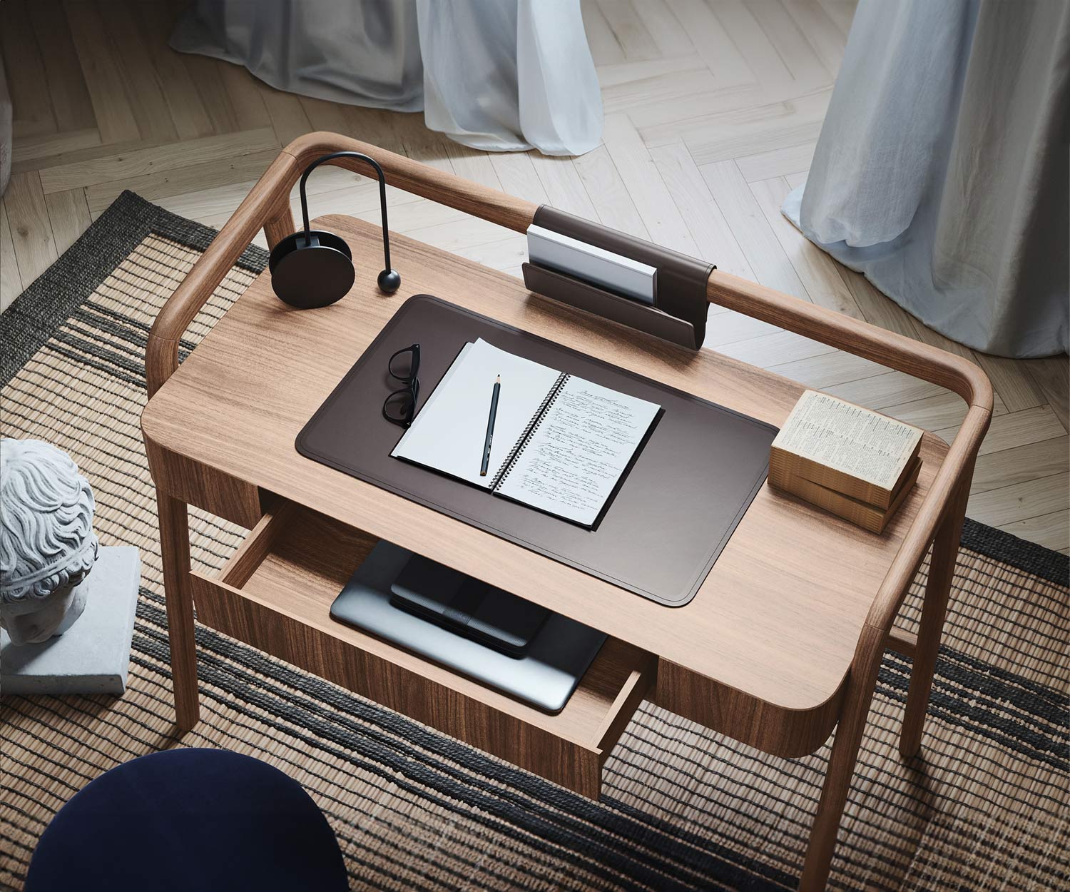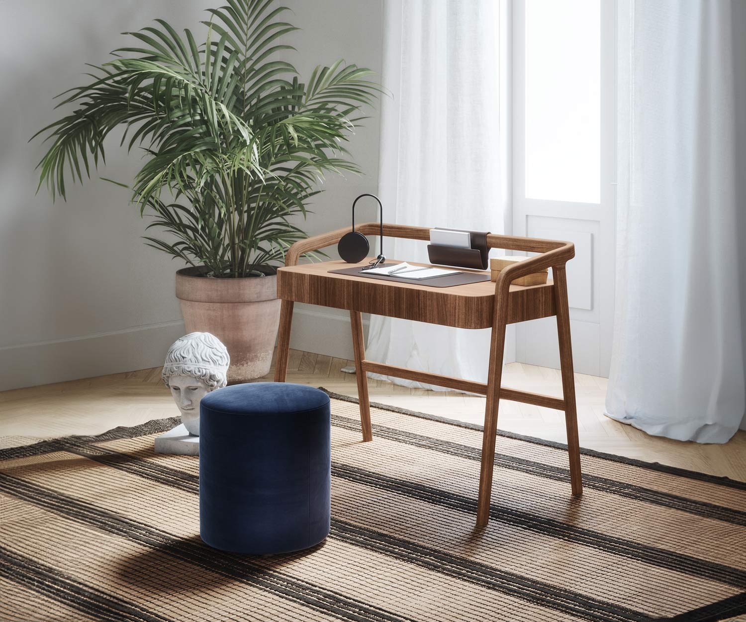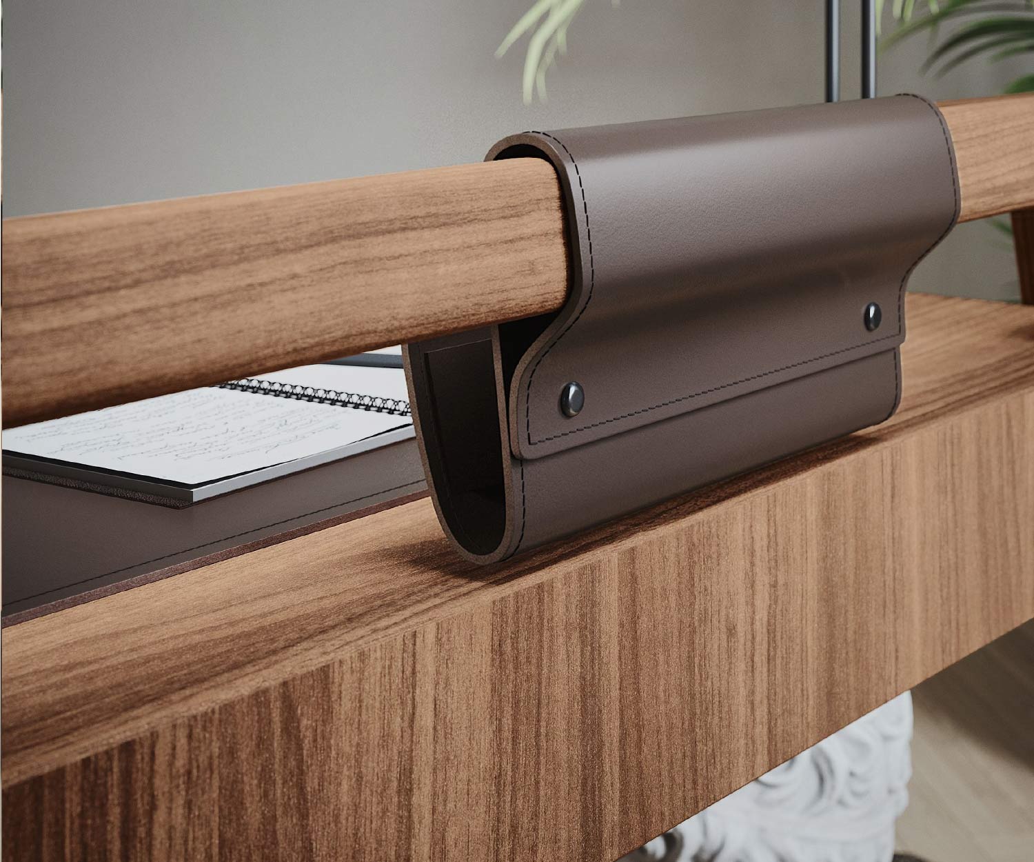 Het Knot bureau is verkrijgbaar in Canaletto N03 walnoot . De bureauaccessoires zijn gemaakt van glad leer met een donkerbruine afwerking.