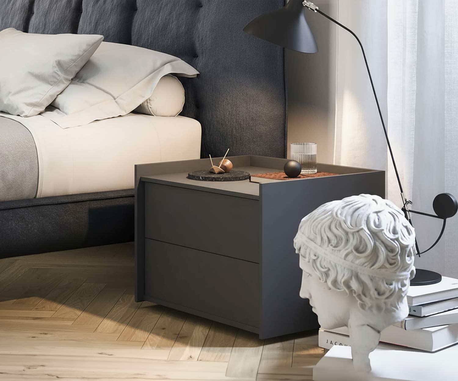 Het nachtkastje is verkrijgbaar in 5 moderne matte kleuren en 2 houtfineren. Matzwart (zoals RAL9017), wit (zoals RAL9016), lichtgrijs (zoals RAL7035), donkergrijs (zoals RAL7022) of beige (zoals RAL1019). Ook verkrijgbaar in eiken Rovere Chiaro N04 of walnoot Noce Canaletto N04.