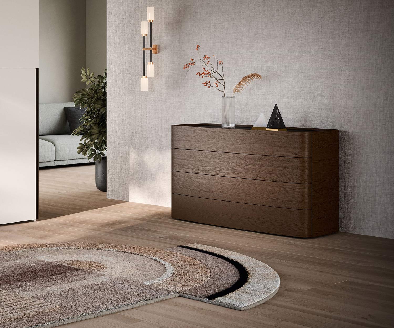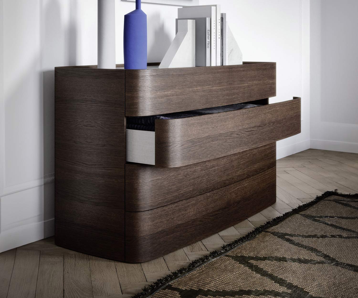 De Norman ladekast met slaapkamerdesign wordt geproduceerd door de fabrikant Novamobili in Italië. De afgeronde hoeken en het natuurlijke eikenfineer zijn een bijzonder designkenmerk. De ladekast is ook verkrijgbaar met een optionele 12 mm dikke afdekplaat van wereldberoemd Carrara marmer.