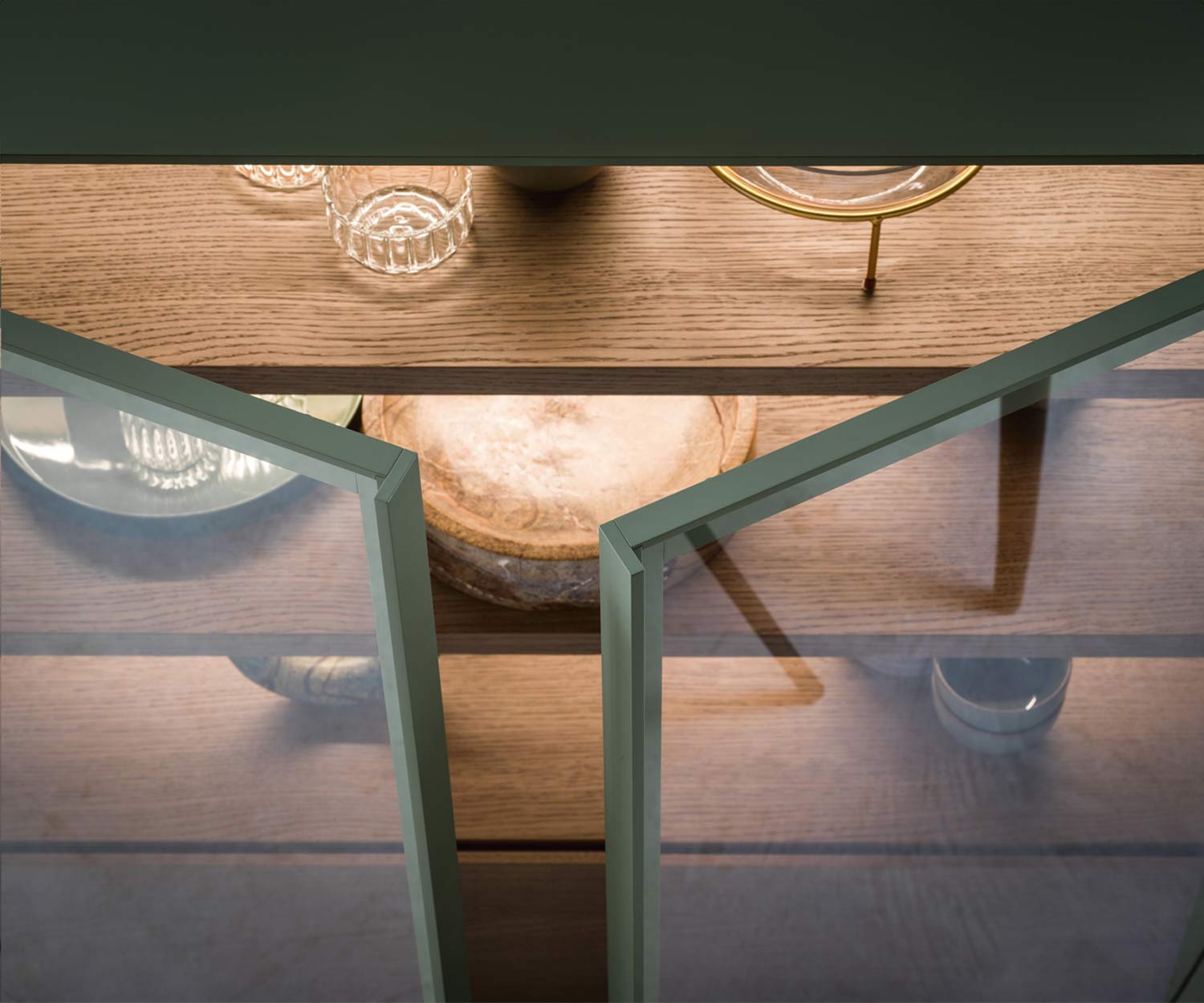 Met mat gelakte klepdeuren of met glasdeuren of glasdeuren met binnenladen. Het basisframe van de highboard is van metaal en is gelakt in mat zwart RAL9005.