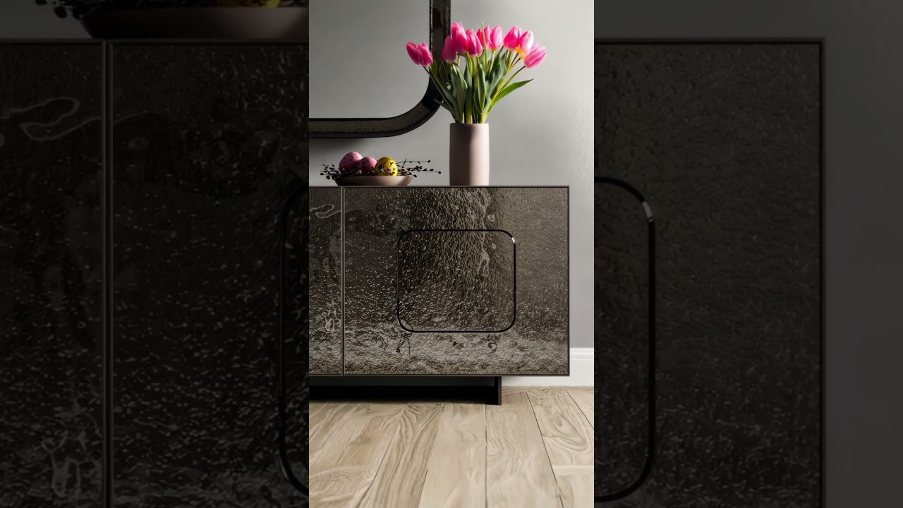 Het ontwerp van het glazen dressoir Ozzio Giulia maakt het tot een uniek meubelstuk. uniek meubelstuk. Dit komt door de speciaal ontworpen deuren, waarin de waarin de omgeving altijd anders wordt gereflecteerd, afhankelijk van de lichtinval. De metalen poten geven het een zwevend effect, waardoor het heel licht lijkt. zeer licht.