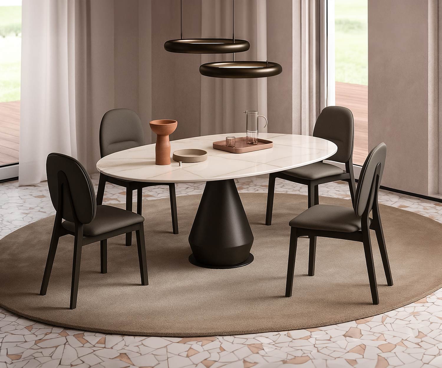 Het opvallende frame van de Lycos eettafel van Ozzio wordt altijd geleverd in een elegante kleur. Je kunt kiezen uit grafiet, cement-aardetinten of betonlook. Voor het tafelblad kun je kiezen uit een eigentijdse houtlook in natuurlijk eiken of keramiek in Calacatta wit of Emperador bruin. Een populaire keramiek is ronde eettafel wit.