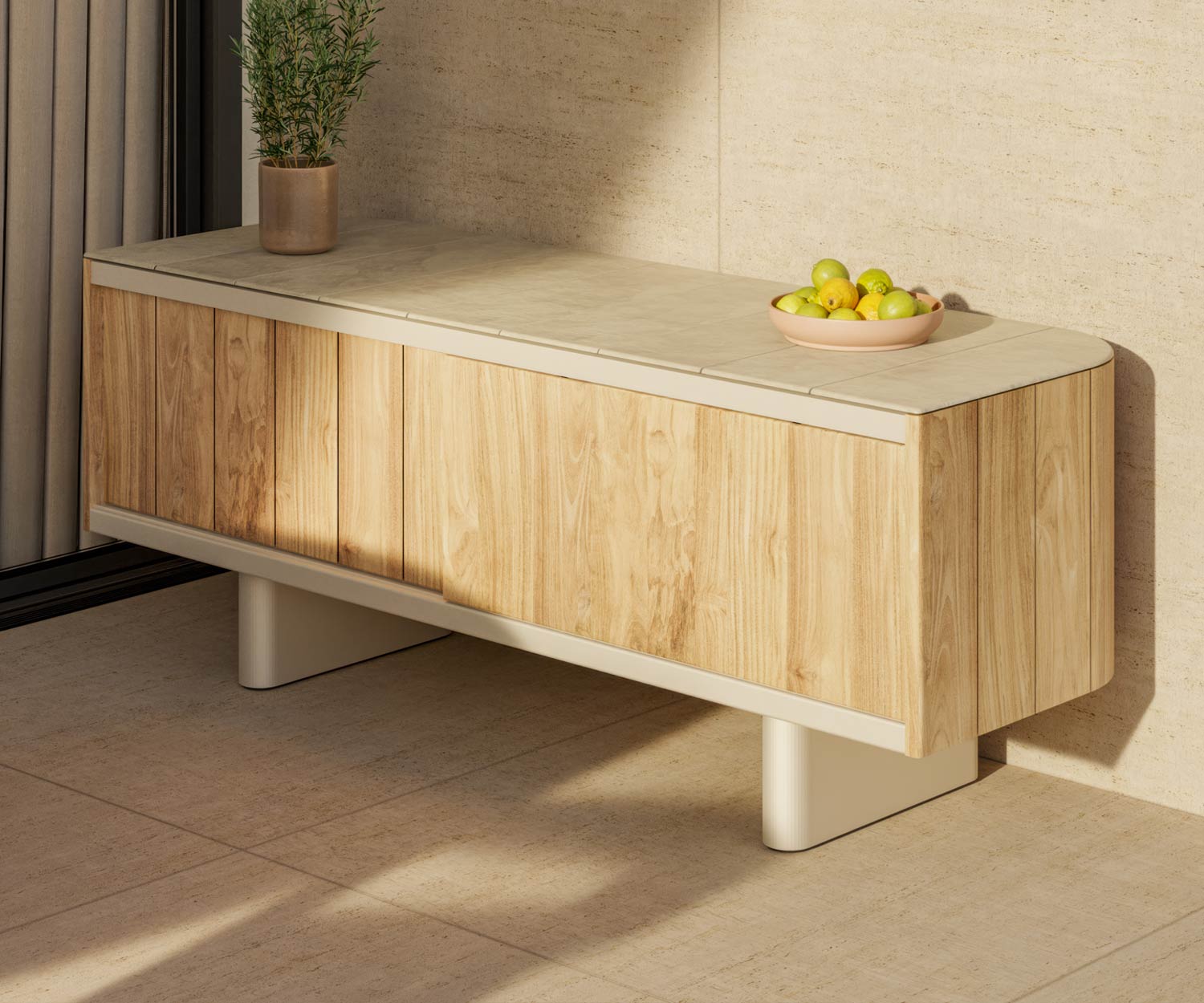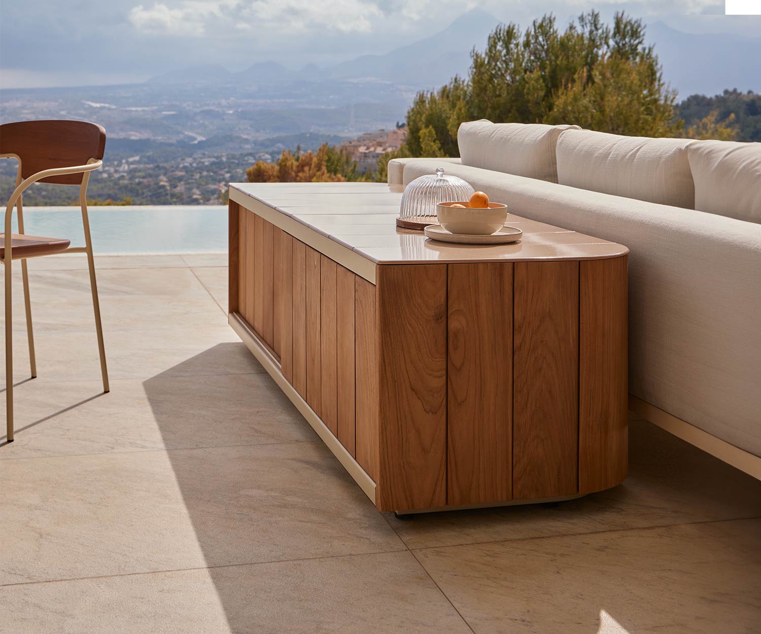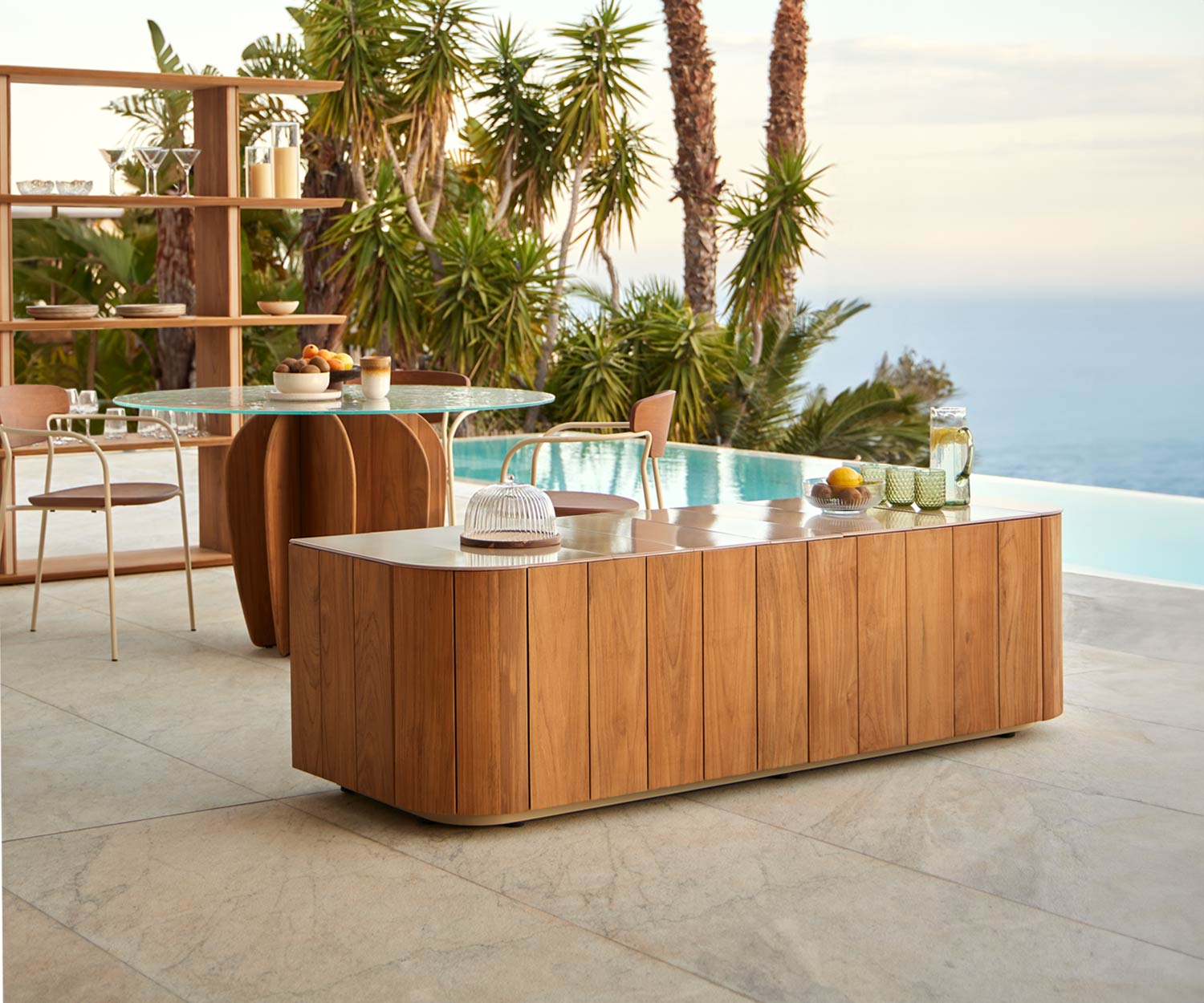 Met zijn nieuwe materialen - de combinatie van hoogwaardig keramiek en teak - biedt het Atrio outdoor dressoir