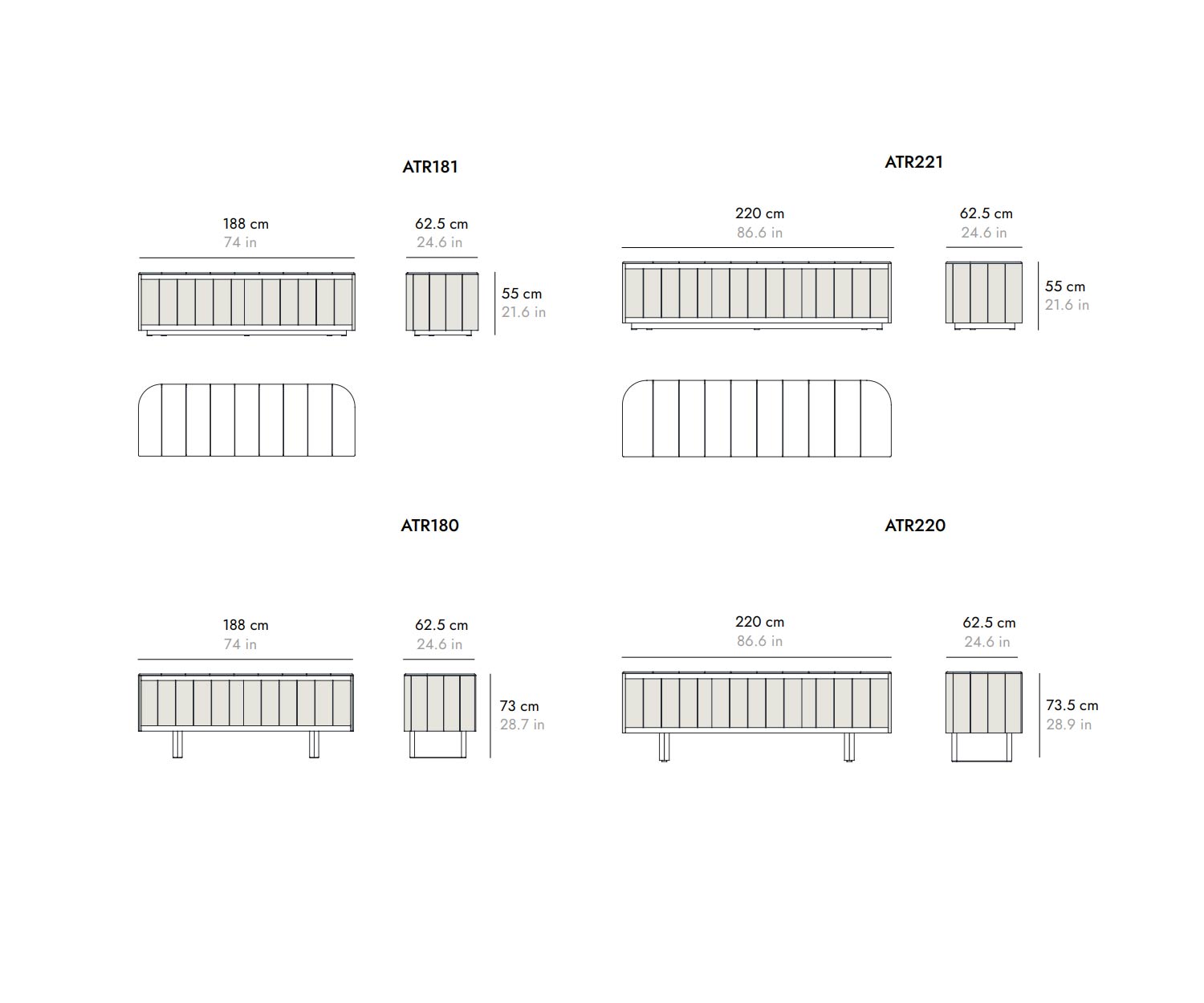B 188 cm / H 55 cm / D 62,5 cm B 188 cm / H 73,5 cm / D 62,5 cm (met poten)