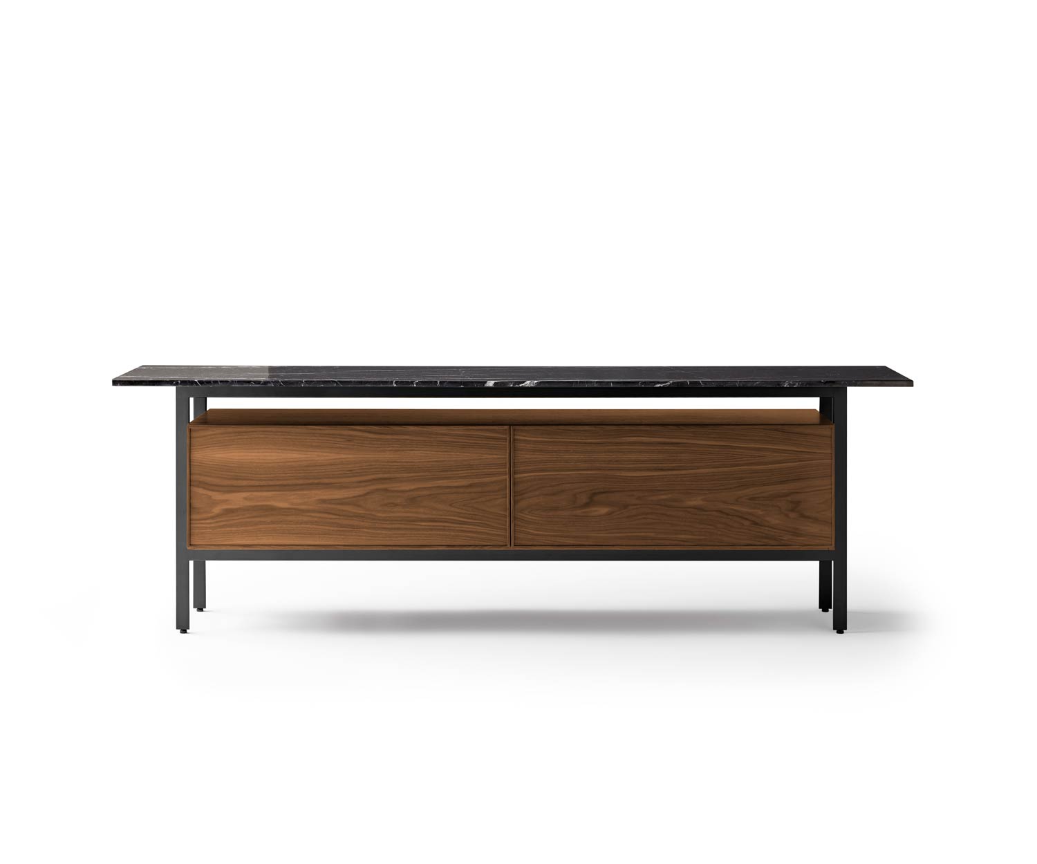 Het elegante dressoir Chicago van Punt is verkrijgbaar in de romp en het front in de houtkleuren front in de houtkleuren supermat walnoot of gebeitst zwart walnoot, het bovenblad in de marmerkleuren Sahara Marble Black, Marquina Marble Black of Carrara Marble White. De glazen voorkant is transparant. Het metalen frame en de basis zijn met zwarte epoxy zwart geschilderd.