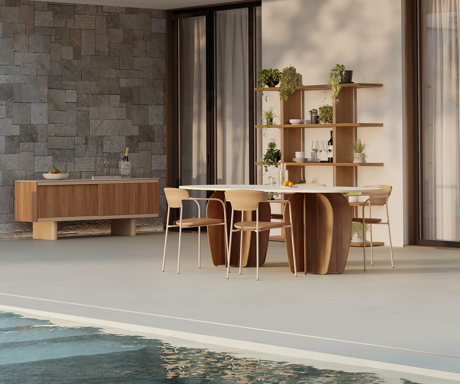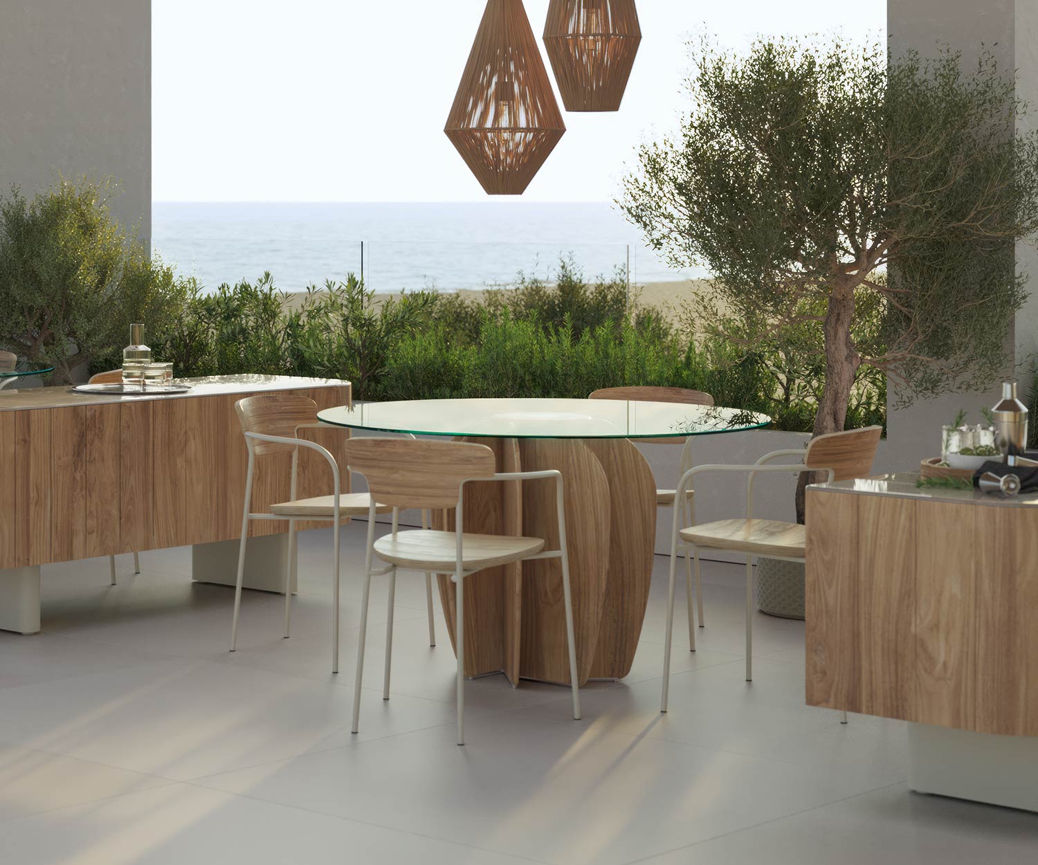 enbiedt een authentieke sfeer met zijn nieuwe materialen, teak en klei, en is tegelijkertijd weerbestendig. Het hoogwaardige ontwerp van de tafelpoten maakt van je terras iets speciaals. Punt H et exclusieve Atrio dressoir voor buiten is verkrijgbaar bij de Coral eettafel.