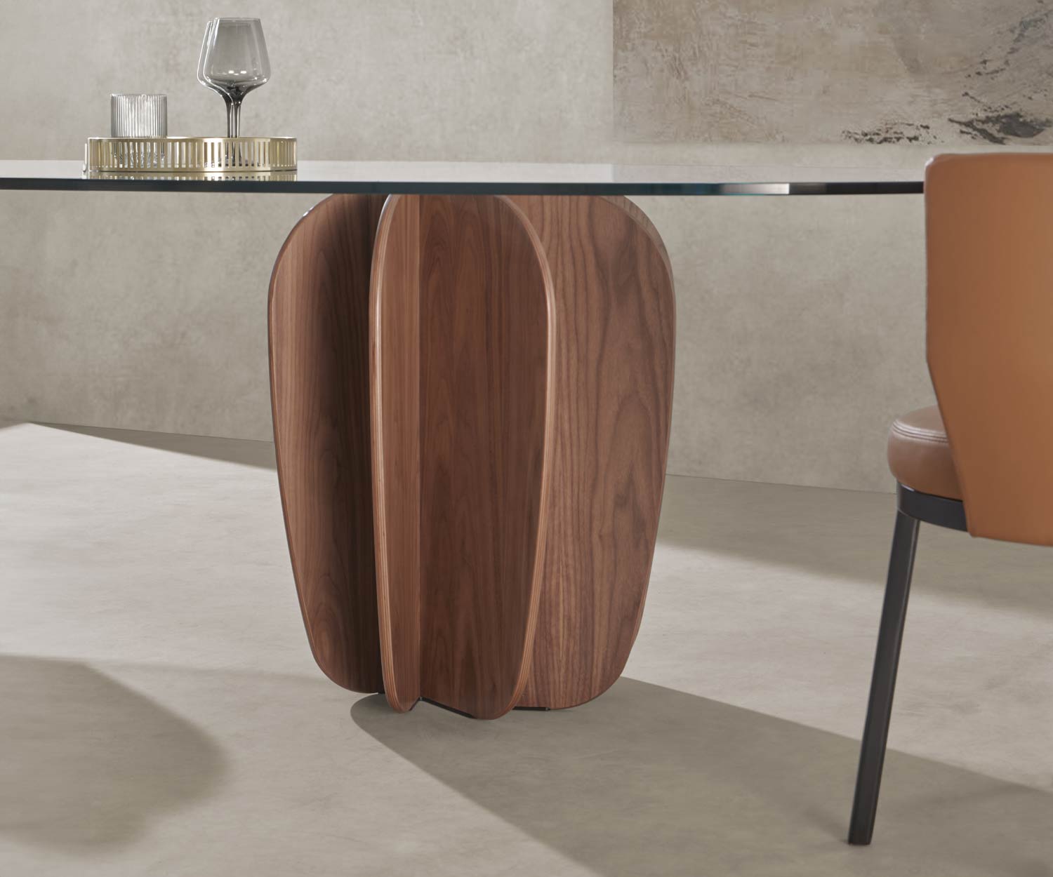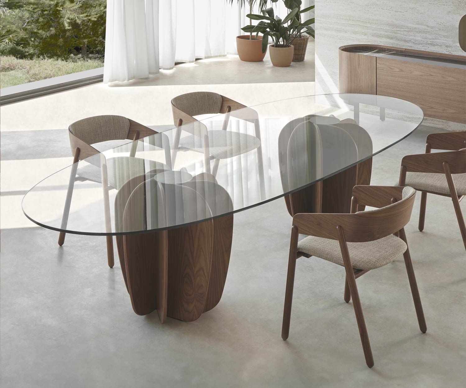 Punt De Coral design eettafel is verkrijgbaar met de tafelpoot in naturel teakhout . Het tafelblad is verkrijgbaar in transparant glas of Dekton aluminium. Een roestvrijstalen bovenplaat verbindt het glazen blad met de houten poot.