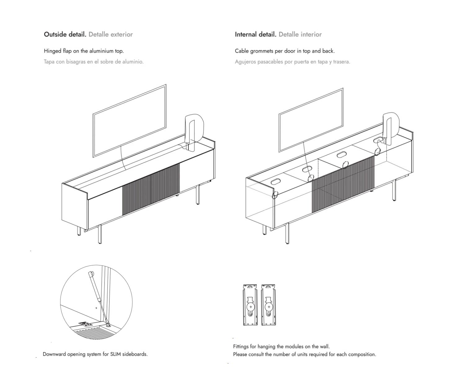 Het TV lowboard Stockholm heeft infrarood doorlatende lamellen waarachter elektronische apparaten eenvoudig kunnen worden bediend. De lamellen helpen ook om de warmteuitwisseling te optimaliseren. De deuren van het dressoir scharnieren bij het openen zonder handgrepen naar beneden (hoek van 105°).