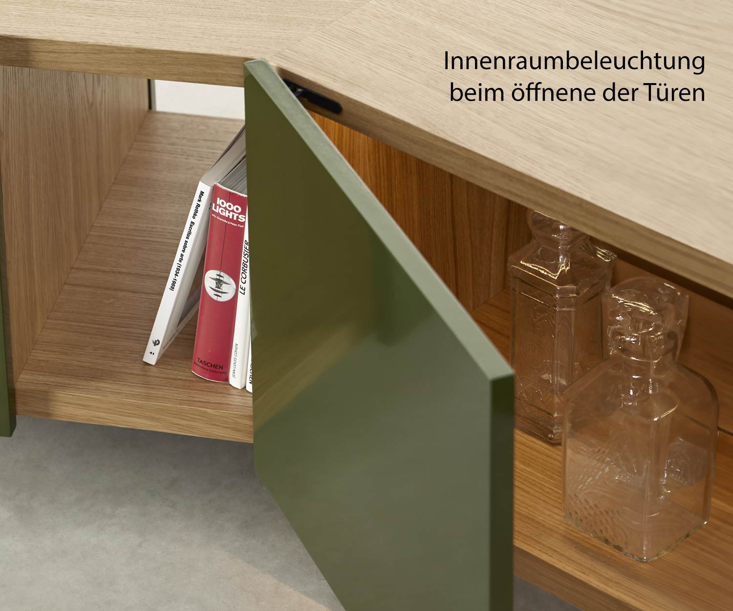Ontworpen als dressoir voor in de hoek, biedt het greeploze deuren die in een hoek van 90 graden kunnen worden geopend. De in hoogte verstelbare poten maken flexibele aanpassing aan elke vloer mogelijk. vloer. LED interieurverlichting (2.700 K) gaat aan wanneer de portieren worden geopend en gaat weer uit wanneer de portieren worden gesloten.
