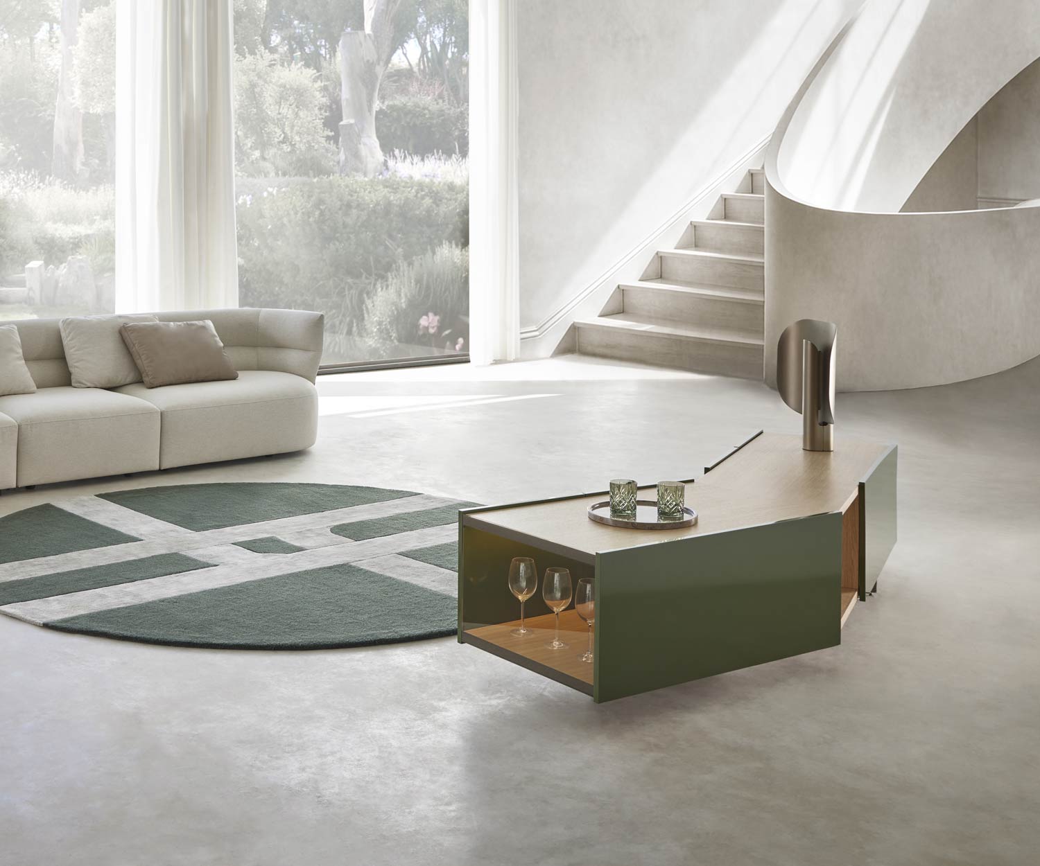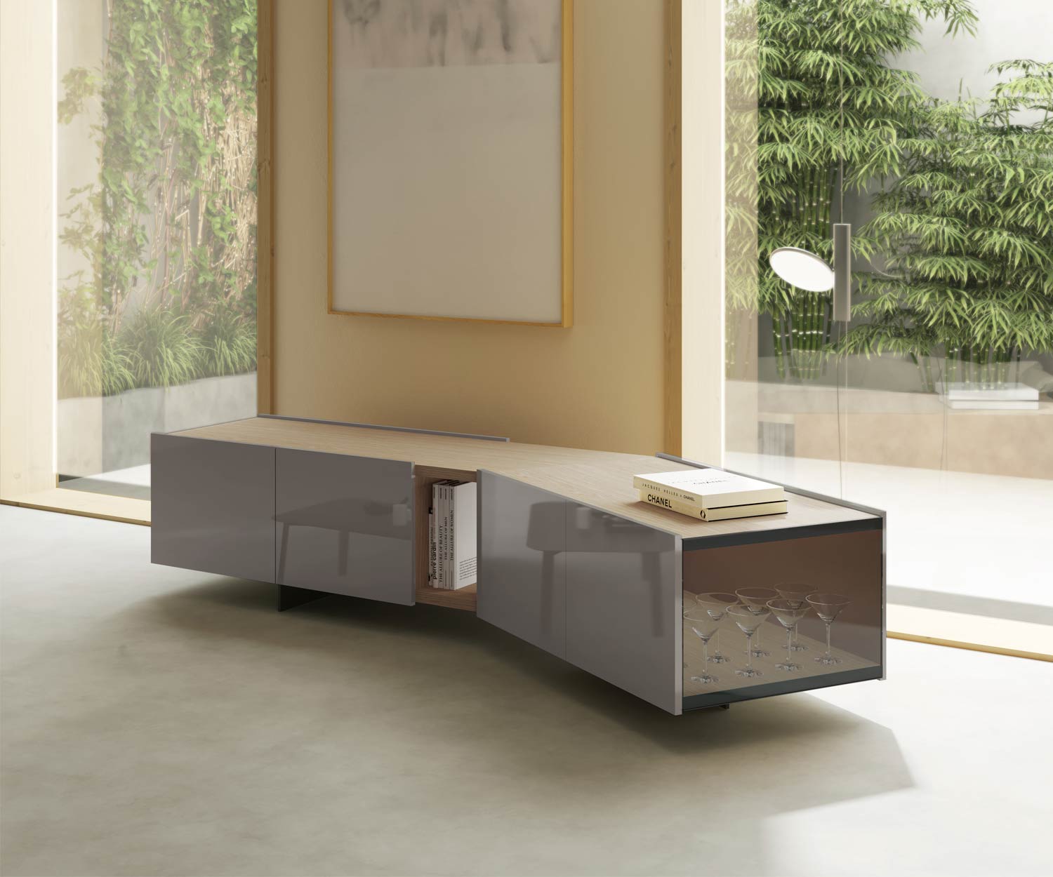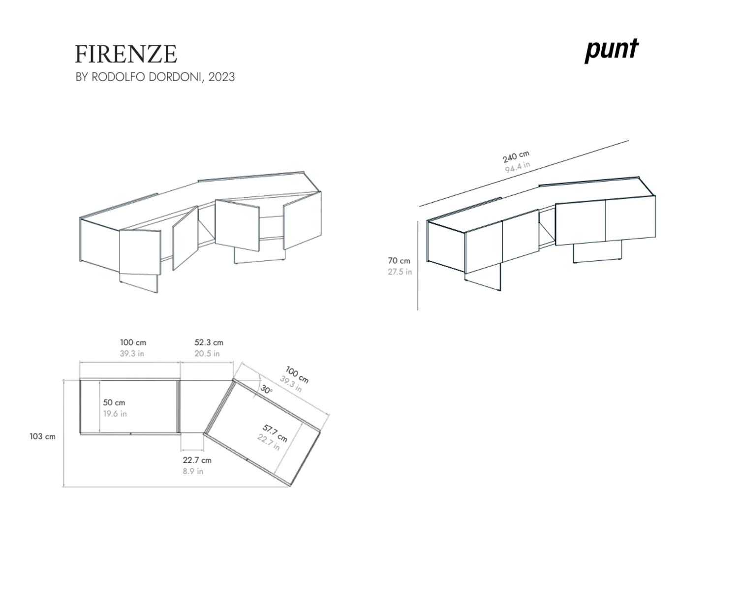 Het bijzondere aan het Punt Toscana Firenze dressoir is zijn zijn kromming in een stompe hoek. Hierdoor zorgt dit ontwerp ervoor dat het meubel in de kamer en brengt het het dichter van de klassieke muurpositie naar het midden midden met eettafel en stoelen.