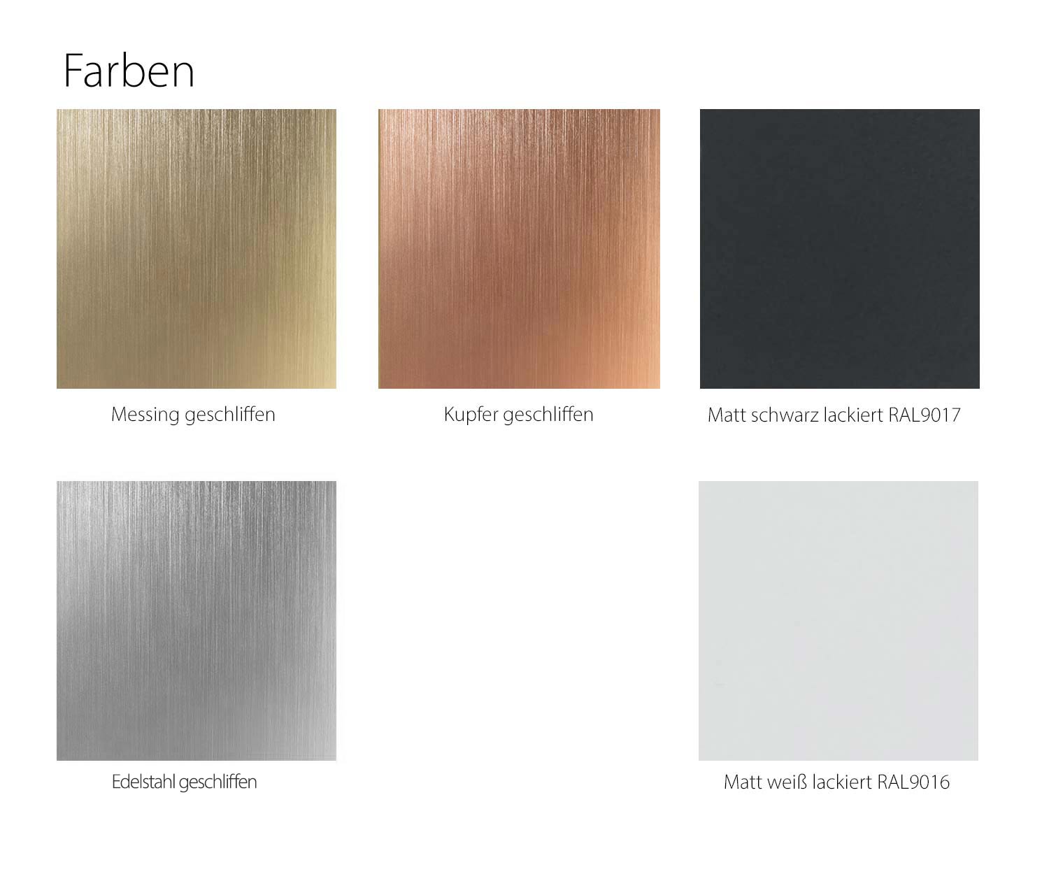 Het frame en het dienblad van de standaard bijzettafel M5 zijn verkrijgbaar in zwart mat RAL 9017 en wit mat RAL 9016. De versie Splus M5 Edition heeft een frame in zwartgrijs gemiculiseerd ijzererts (zoals afgebeeld) De schalen van de M5 Editions modellen (let op: alleen voor ronde modellen) zijn verkrijgbaar in gepolijst koper of messing, maar ook in geanodiseerd zilver aluminium.