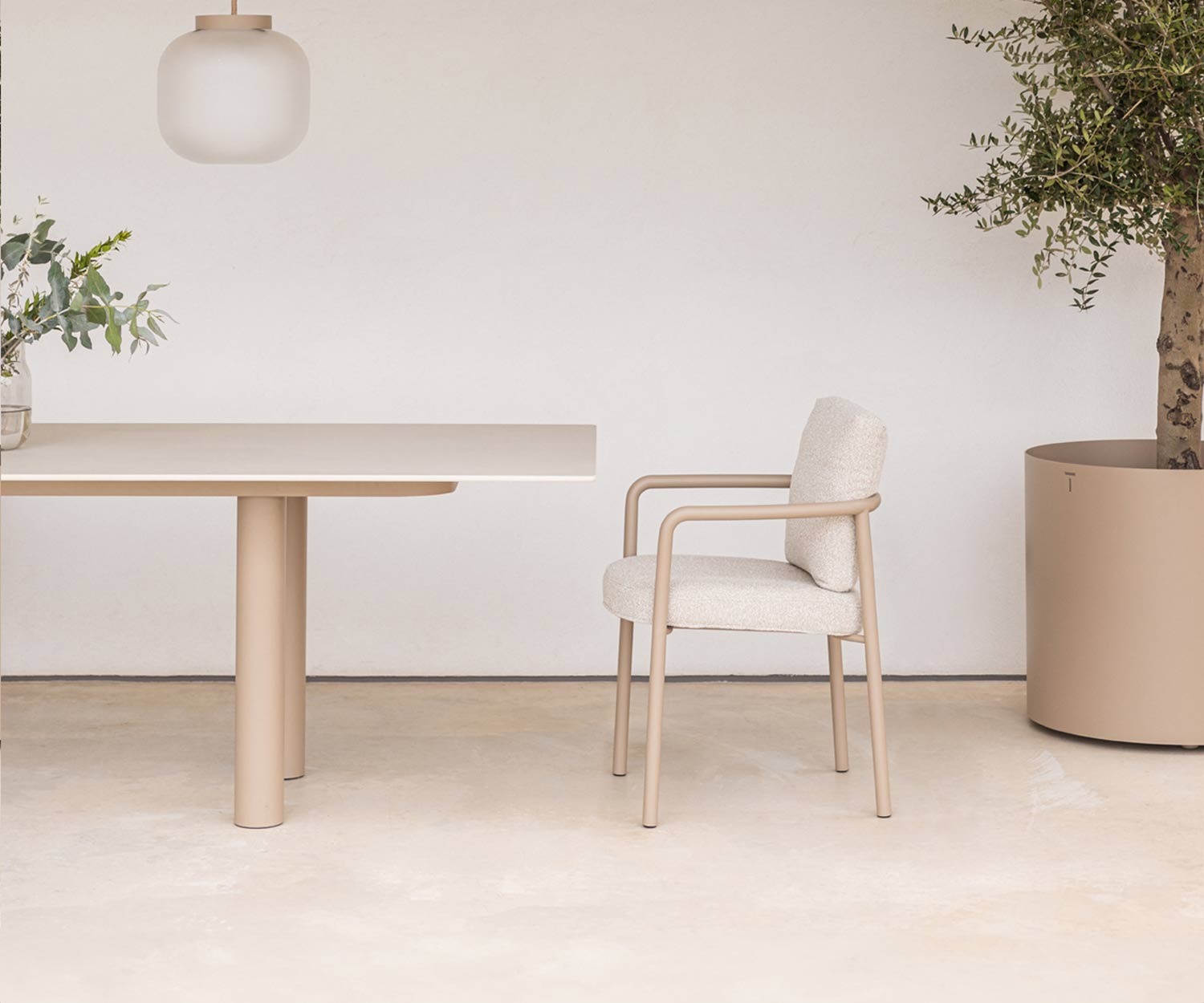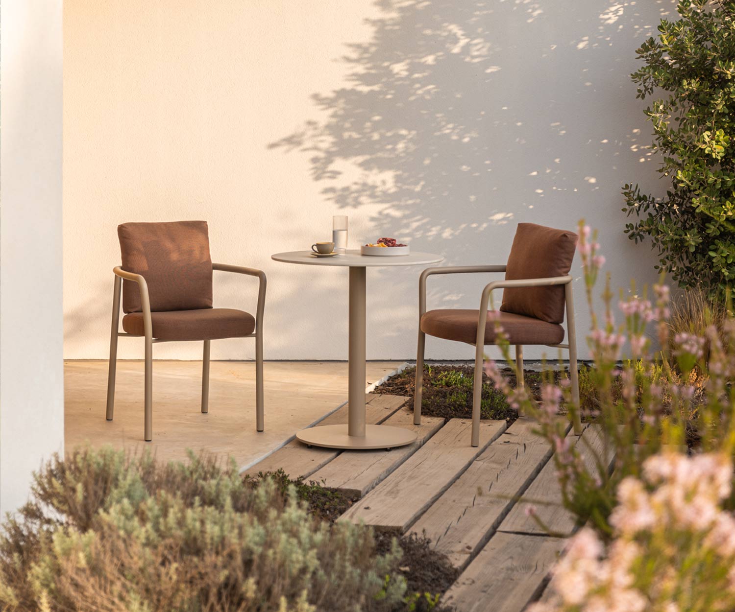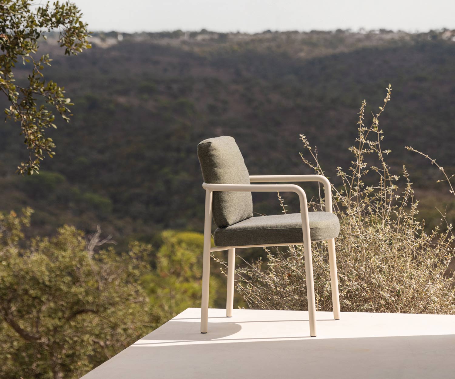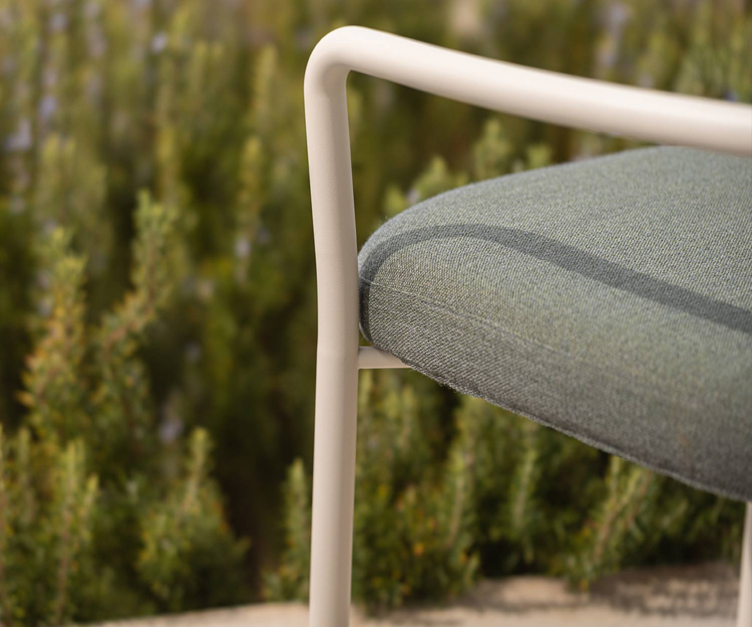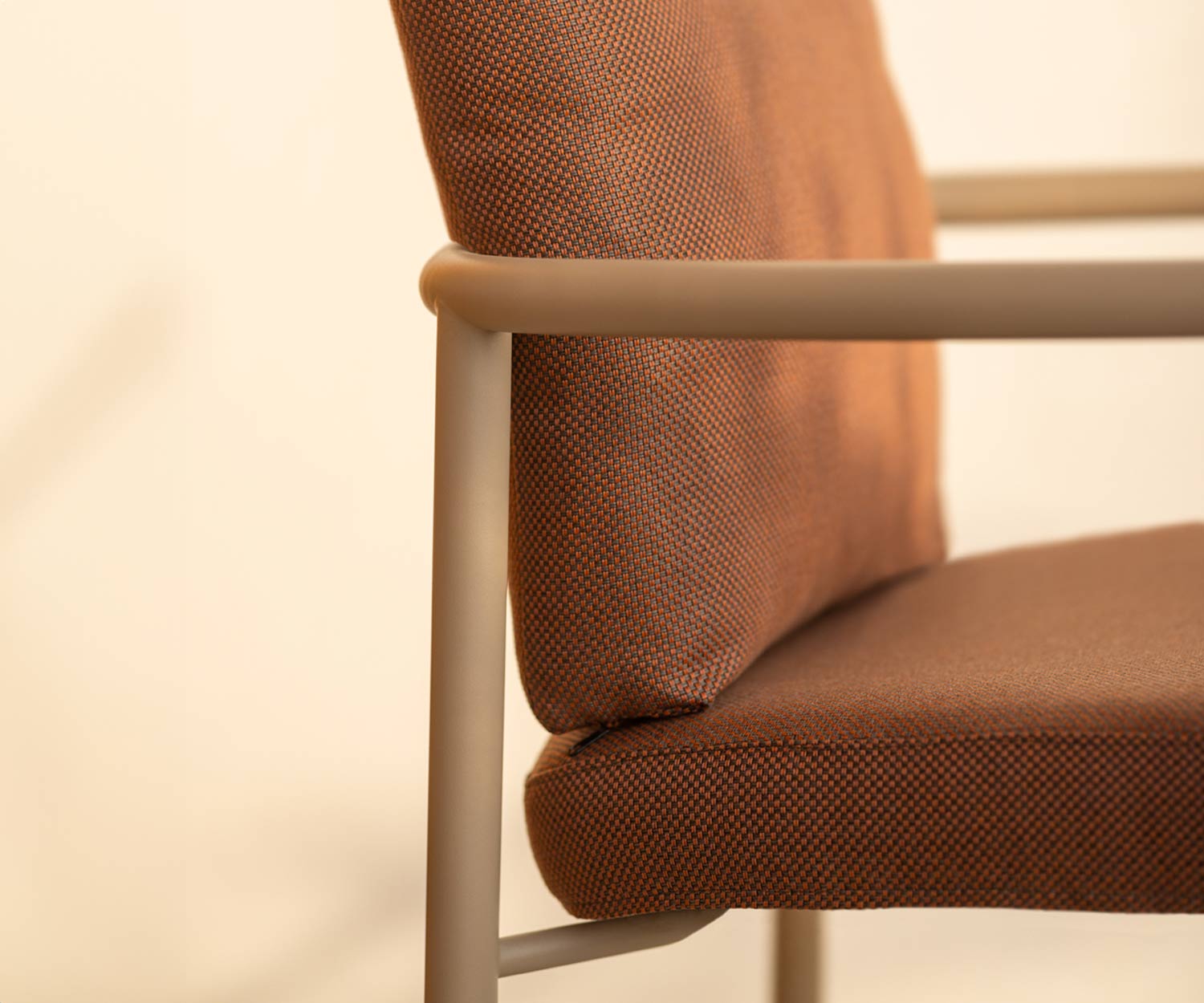 Die Sitz- und Rückenkissen bestehen aus schnelltrocknendem Schaumstoff und sind mit einem pflegeleichten, abnehmbaren Bezug "Crevin Vita" ausgestattet, der speziell auf den Außenbereich zugeschnitten ist. Jedes Detail ist durchdacht, um Komfort und Design harmonisch zu vereinen.