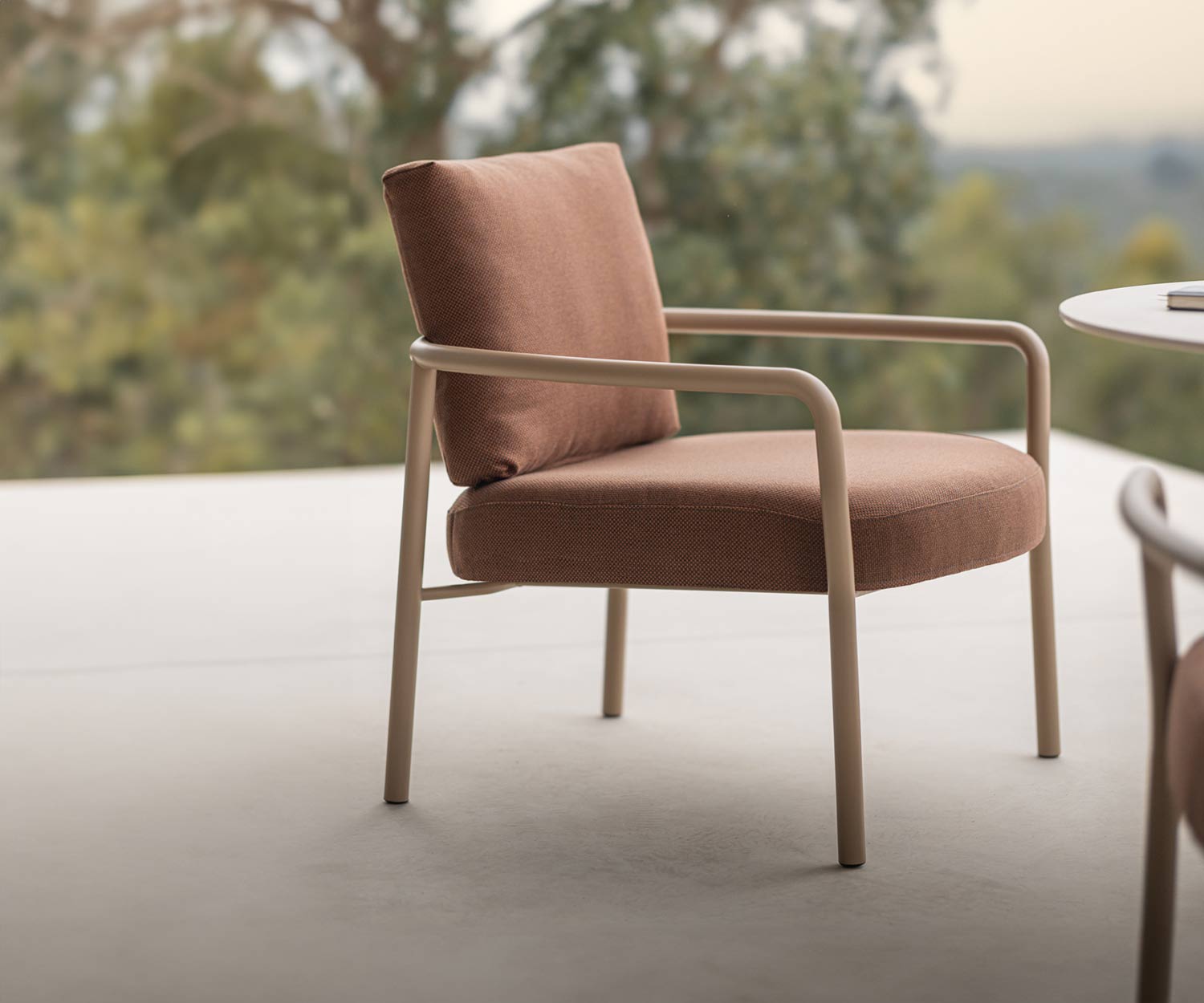 Die Sitz- und Rückenkissen bestehen aus schnelltrocknendem Schaumstoff und sind mit einem pflegeleichten, abnehmbaren Bezug "Crevin Vita" ausgestattet, der speziell auf den Außenbereich zugeschnitten ist. Jedes Detail ist durchdacht, um Komfort und Design harmonisch zu vereinen.