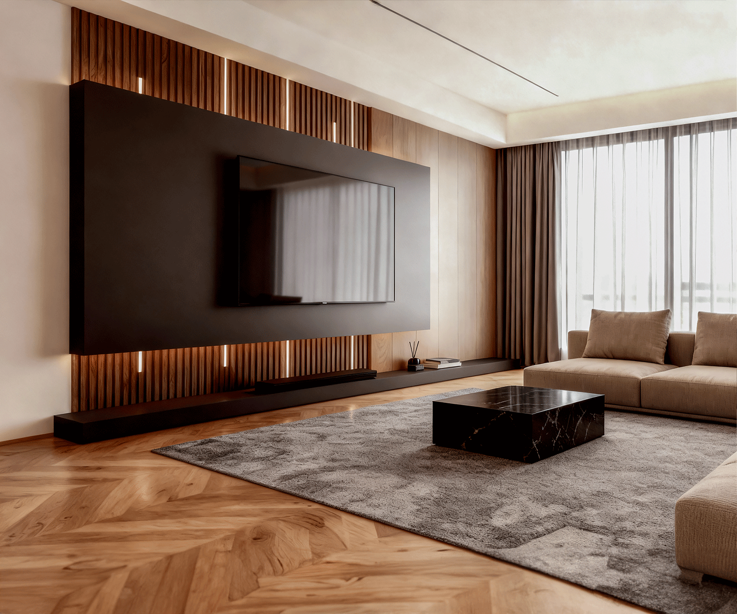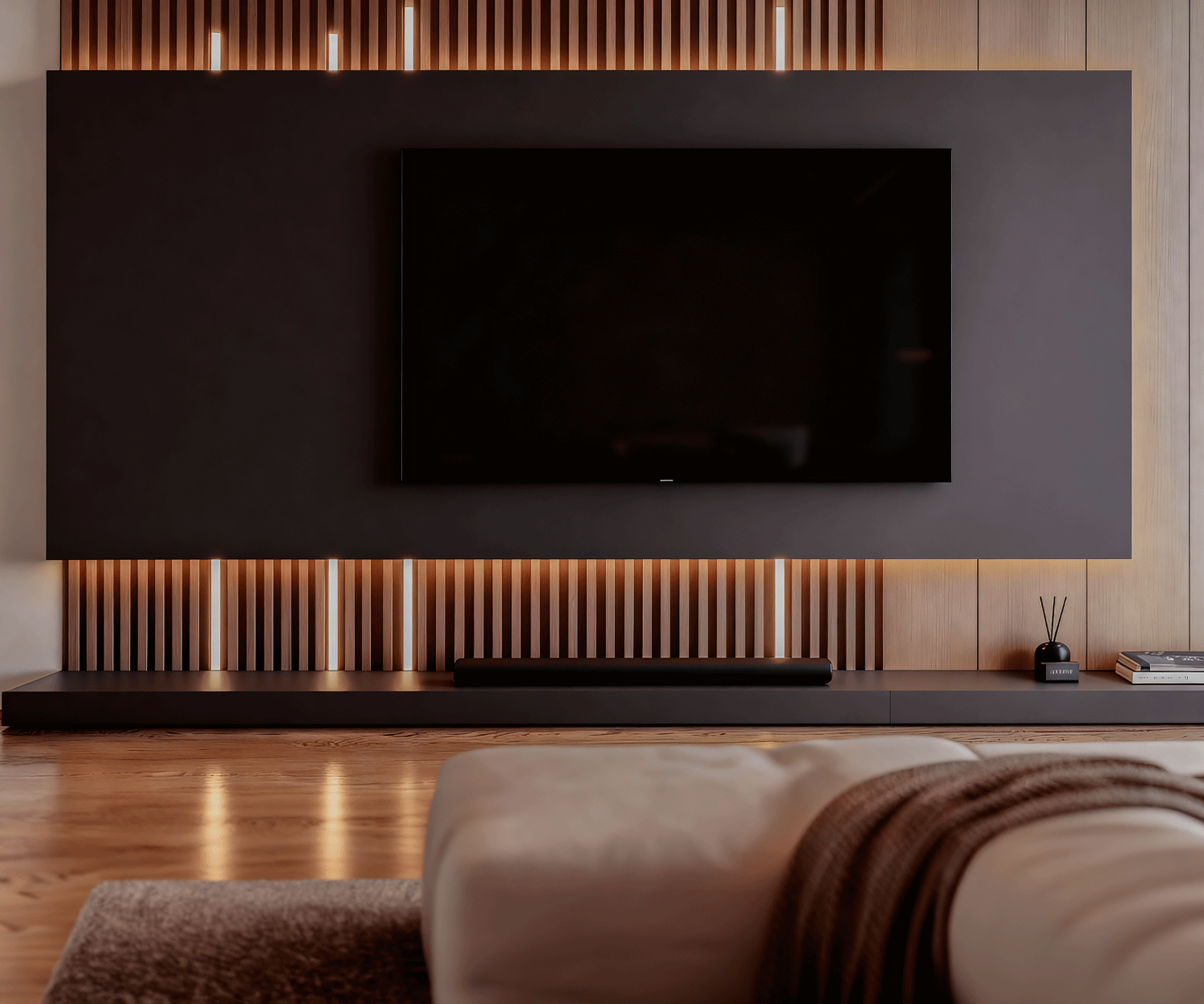 Akoestische houten panelen met LED-verlichting en mat gelakt TV-paneel met TV-paneel