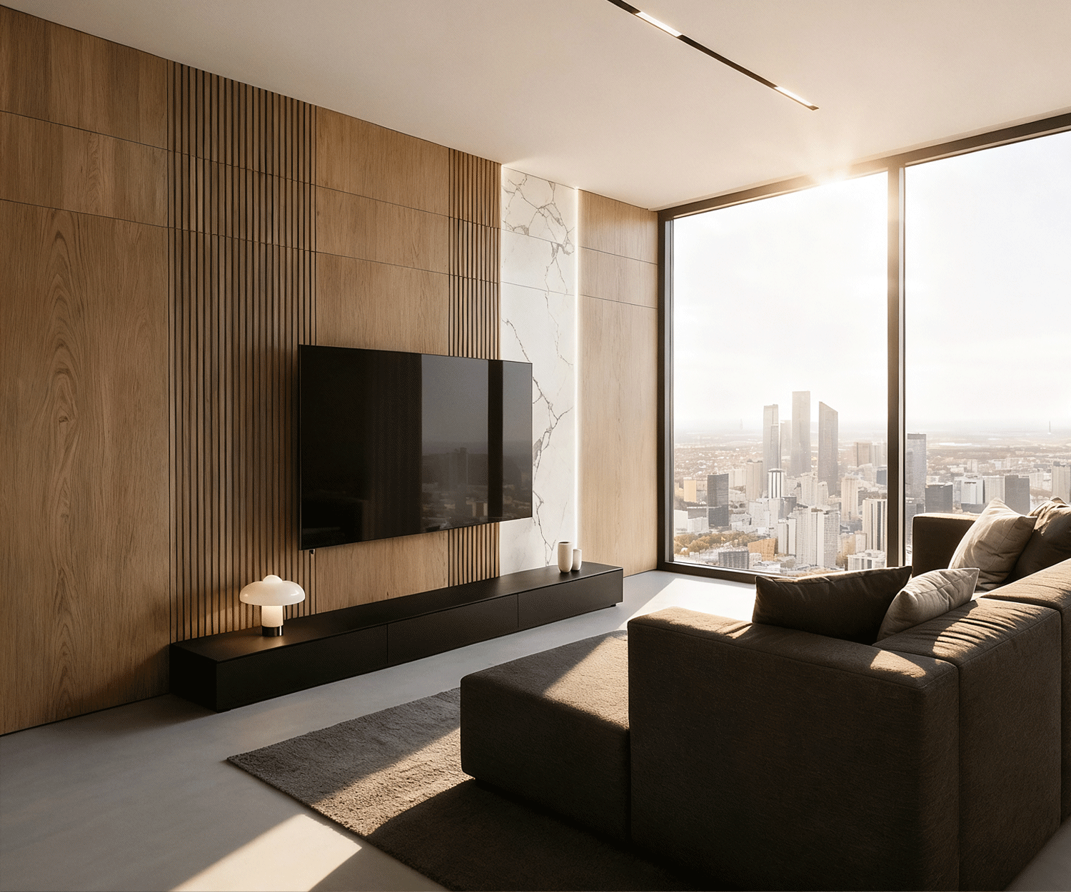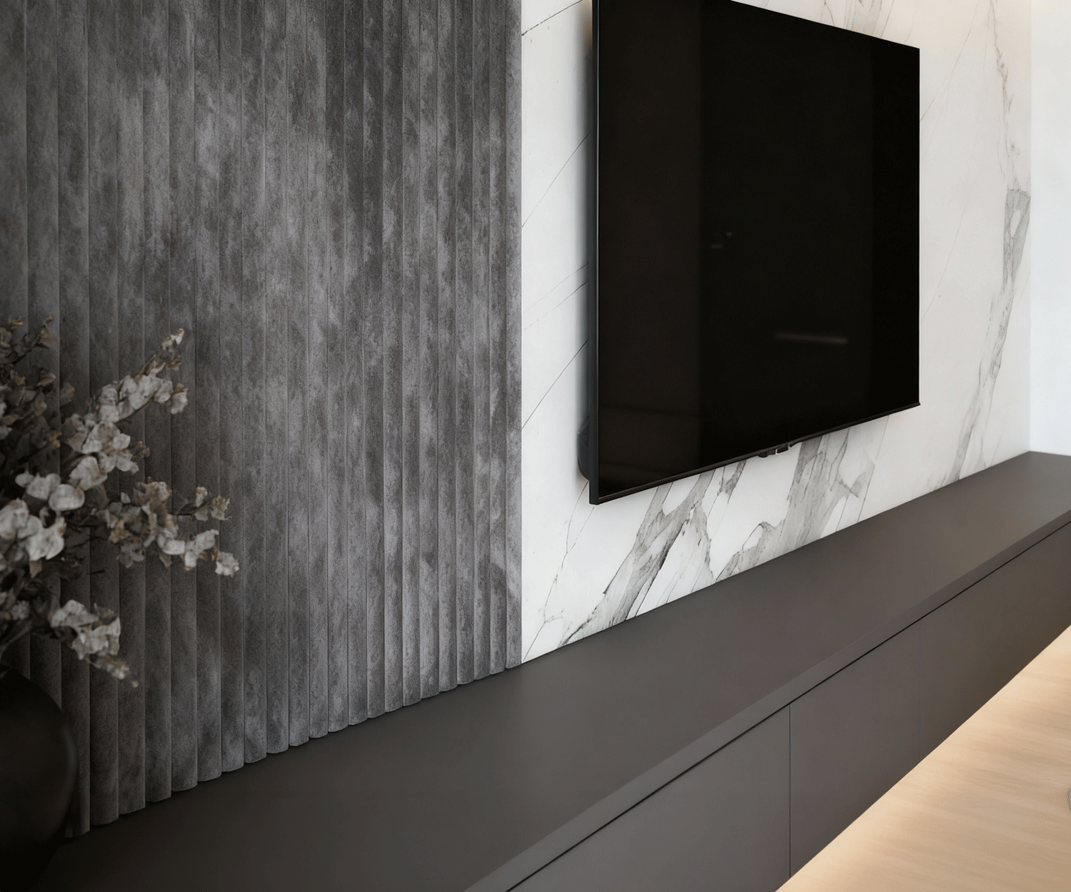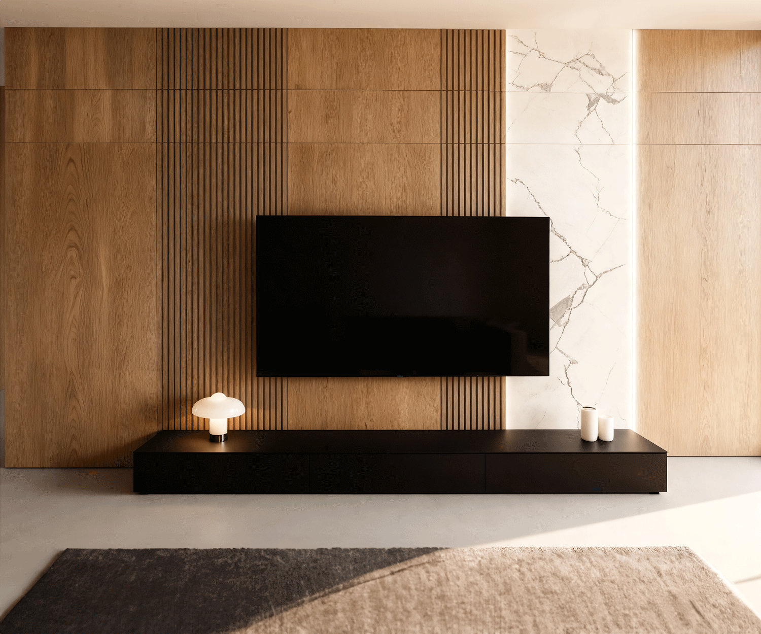 Wandpaneelvan marmer en fluweel met lowboard aan de wand